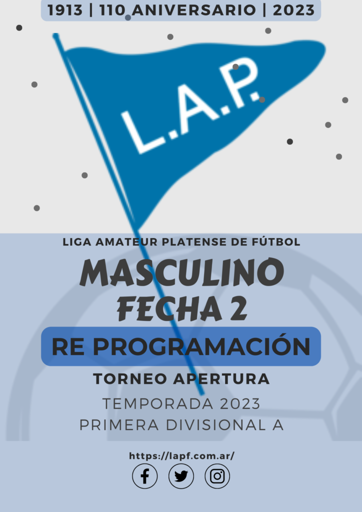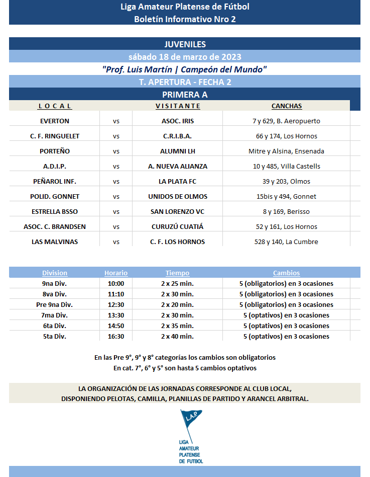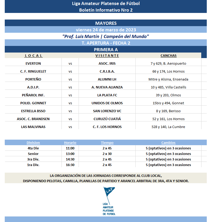 Dada la notificación emitida en el día de la fecha por la Agencia de Prevención de Violencia en el Deporte (A.Pre.Vi.De.) a la Departamental La Plata, las comisarias y destacamentos de la región no contarán con efectivos policiales para cubrir las jornadas del sábado 18 y domingo 19 de marzo en ocasión de la disputa del clásico entre Gimnasia vs Estudiantes por la Fecha 8 de la Liga Profesional. En razón de lo cual, la que la Mesa Directiva decidió POSTERGAR los cotejos de MAYORES de la FECHA 2 del Torneo Apertura “Prof. Luis Martín | Campeón del Mundo” para el próximo VIERNES 24 DE MARZO, disputándose entonces el SÁBADO 18 DE MARZO las jornadas de Infantiles y Juveniles en horarios habituales.