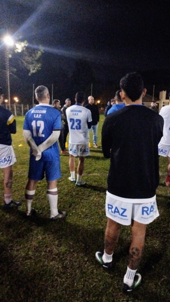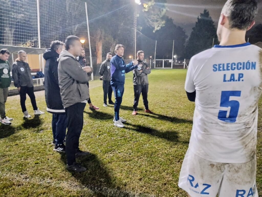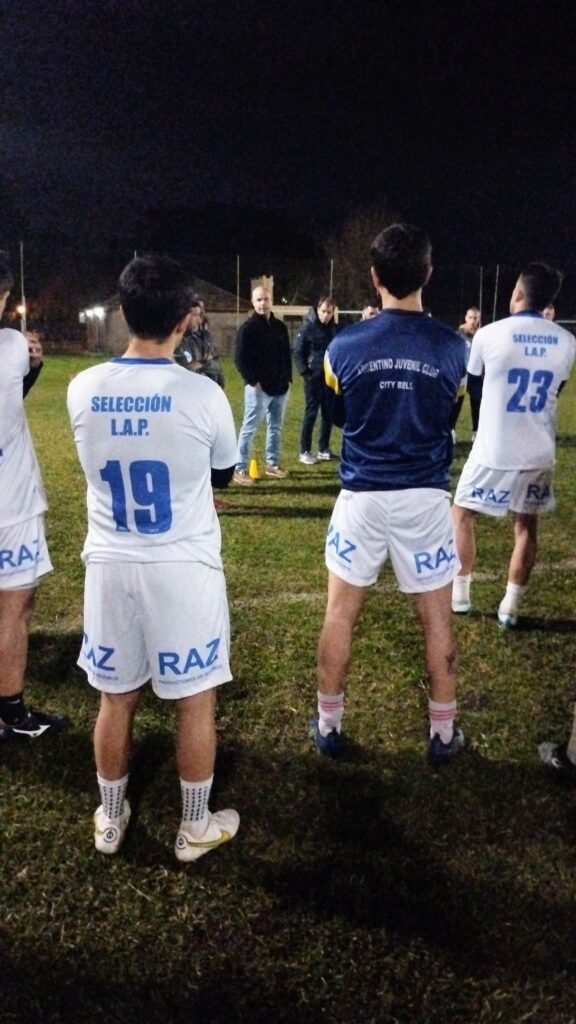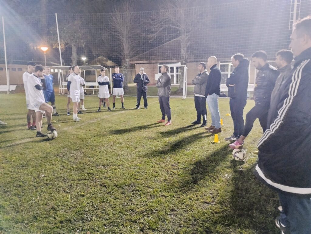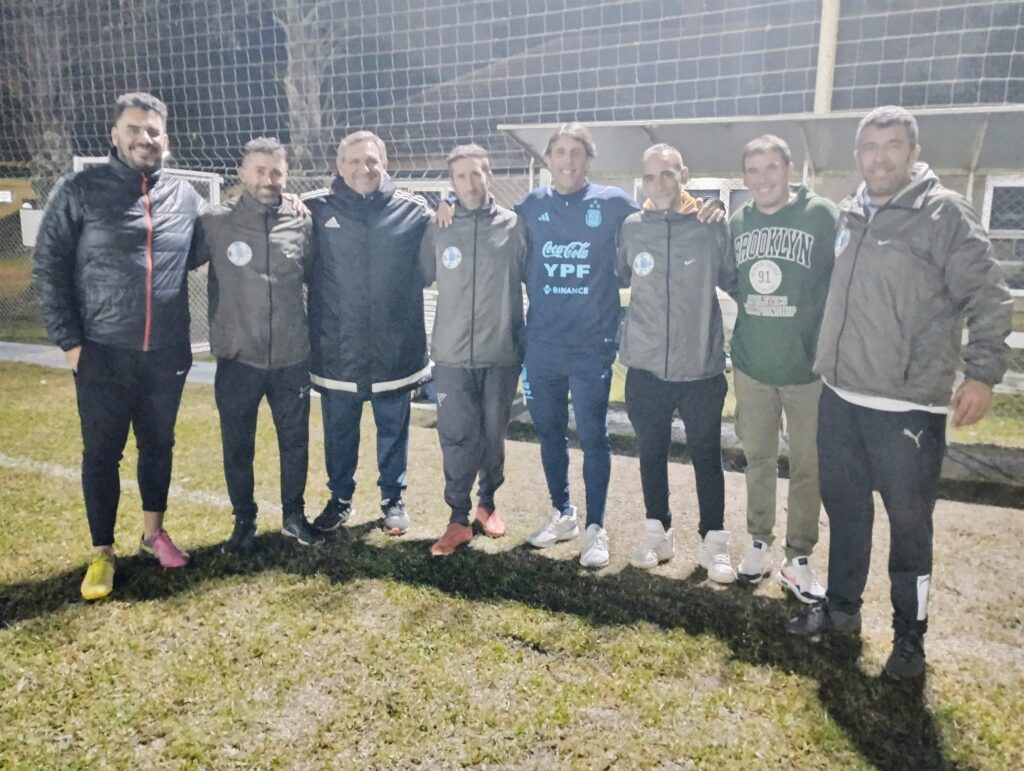 Terminado la práctica y los ejercicios de estiramiento, lo futbolistas recibieron la visita del profe Luis Martín, preparador físico de la Selección Argentina Campeón el Mundo y último capitán del Seleccionado Mayor Masculino de la Liga que obtuvo el título provincial en 1997.