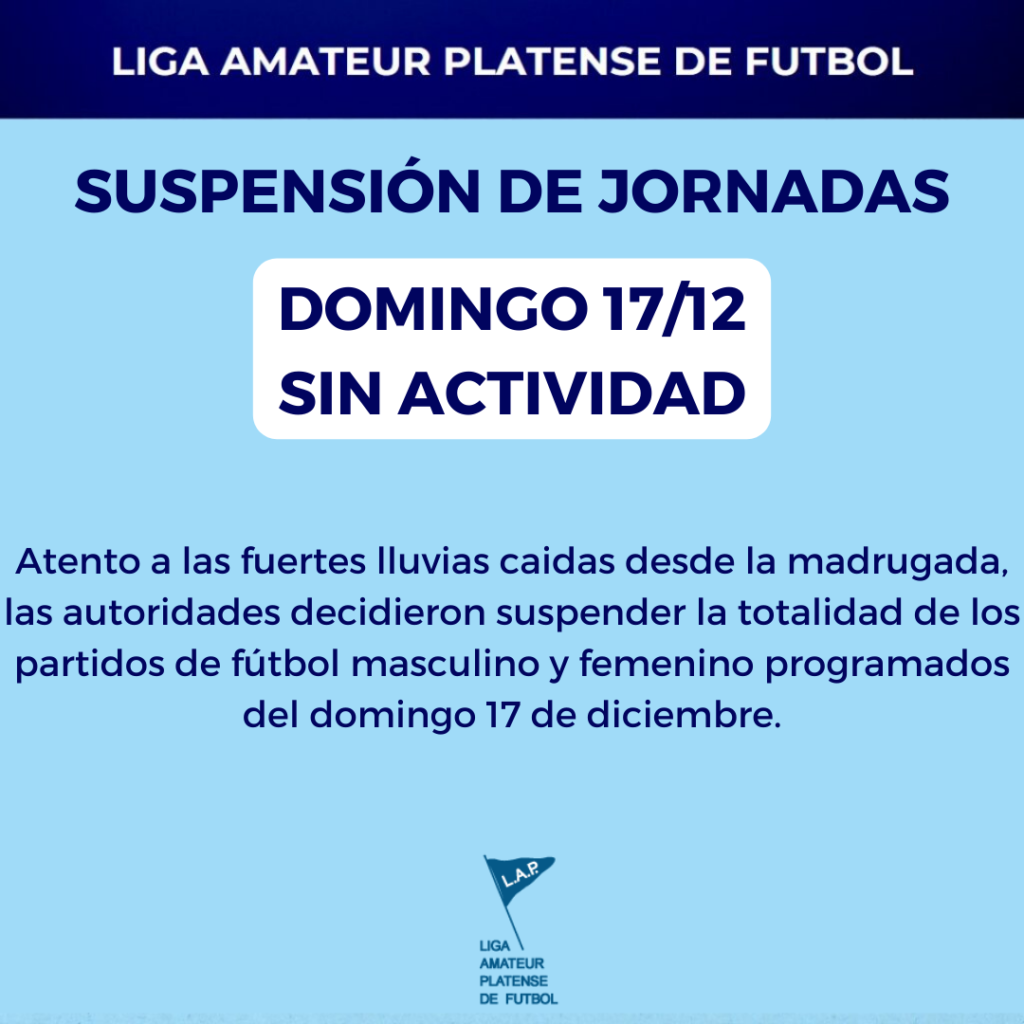 Atento a las fuertes lluvias que se registraron durante la madrugada, la Mesa Directiva, el Área Deportiva y el Departamento de Femenino, apoyados en los dirigentes de los clubes, han decidido SUSPENDER LA PROGRAMACIÓN DE FÚTBOL MASCULINO Y FEMENINO prevista para mañana domingo 17 de diciembre, preservando la integridad física de nuestras jugadoras y jugadores y el estado de los campos de juego.