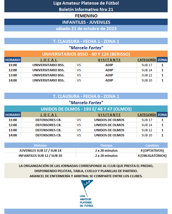 PROGRAMACIÓN NRO 21 – 2023: T. CLAUSURA “Marcelo Fortes”