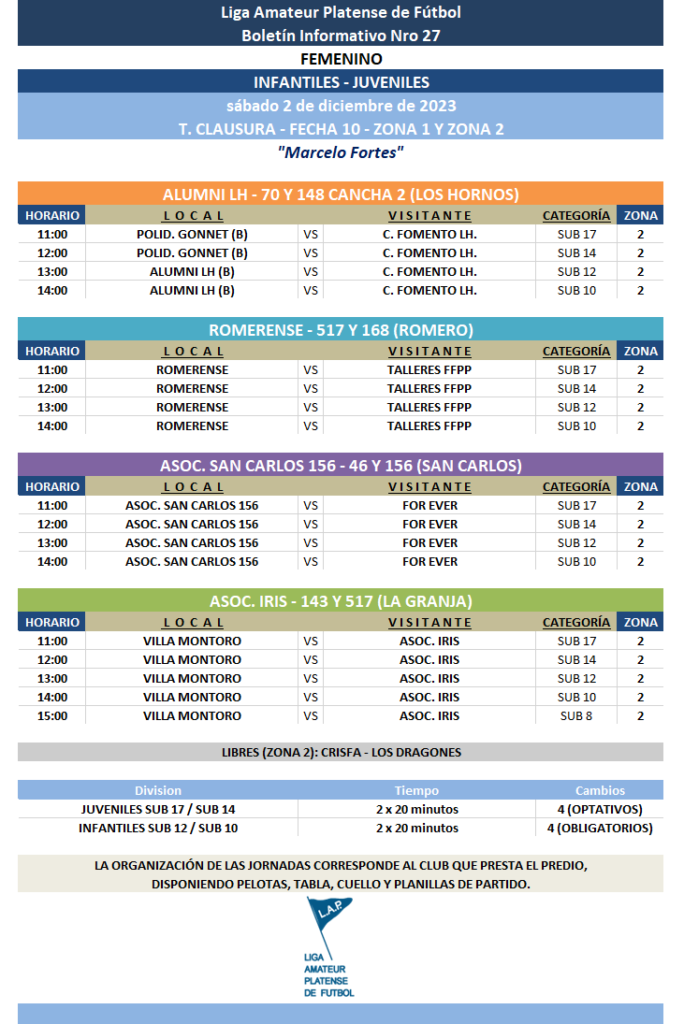 Compartimos la programación de partidos correspondientes a los CUARTOS DE FINAL del T. Clausura “Marcelo Fortes” de Primera Divisional A y las FINALES y REPECHAJES DE ASCENSO Primera Divisional B de Fútbol Femenino y a la FECHA 10 de Juveniles Sub 17 y Sub 14 e Infantiles Sub 12 y Sub 10 de la Zona 1 y de la Zona 2 a disputarse el próximo fin de semana.