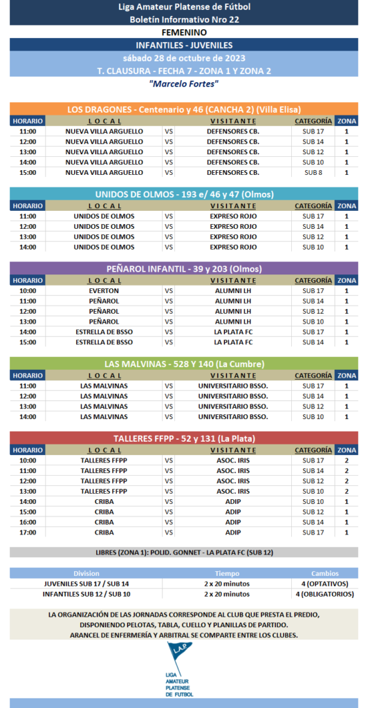 Compartimos la programación de partidos correspondientes a la FECHA 7 del T. Clausura “Marcelo Fortes” de Primera Divisional A y de Primera Divisional B de Fútbol Femenino y a la FECHA 7 de Juveniles Sub 17 y Sub 14 e Infantiles Sub 12 y Sub 10 de la Zona 1 y de la Zona 2 a disputarse el próximo fin de semana.