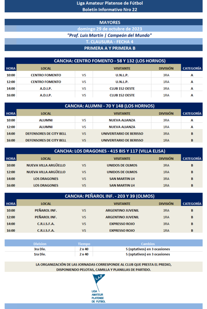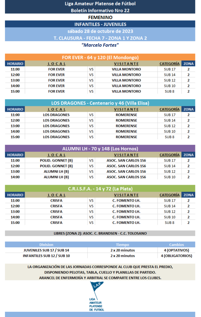 PROGRAMACIÓN NRO 22 – 2023: T. CLAUSURA “Marcelo Fortes”