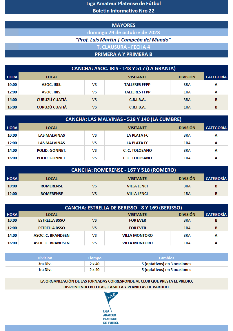 PROGRAMACIÓN NRO 22 – 2023: T. CLAUSURA “Marcelo Fortes”