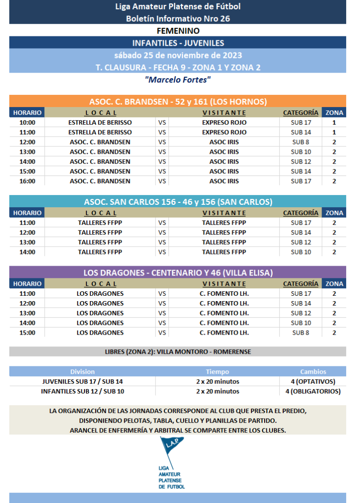 Compartimos la programación de partidos correspondientes a la FECHA 7 del T. Clausura “Marcelo Fortes” de Primera Divisional A y de Primera Divisional B de Fútbol Femenino y a la FECHA 9 de Juveniles Sub 17 y Sub 14 e Infantiles Sub 12 y Sub 10 de la Zona 1 y de la Zona 2 a disputarse el próximo fin de semana.