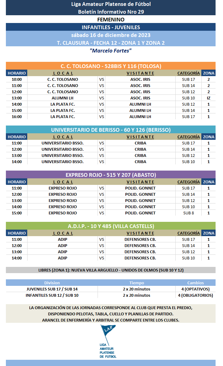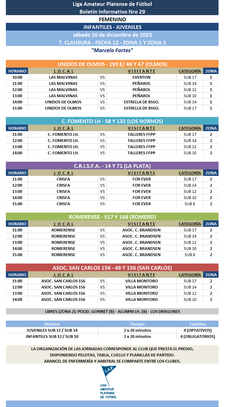 Así mismo, se anuncia la programación de la FECHA 12 de Juveniles Sub 17 y Sub 14 e Infantiles Sub 12 y Sub 10 de la Zona 1 y de la Zona 2 a disputarse el día sábado 16 de diciembre. Y se adelantarán entre semana los partidos pendientes de Infanto – Juvenil entre los clubes ASOC. SAN CARLOS 156 vs FOR EVER el día miércoles 13/12.
