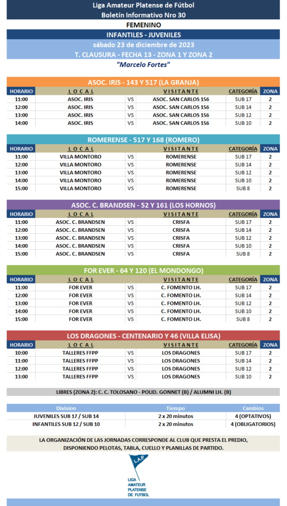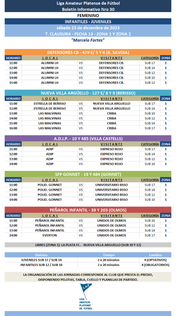 Así mismo, se anuncia la programación de la FECHA 13 de Juveniles Sub 17 y Sub 14 e Infantiles Sub 12 y Sub 10 de la Zona 1 y de la Zona 2 a disputarse el día sábado 23 de diciembre.