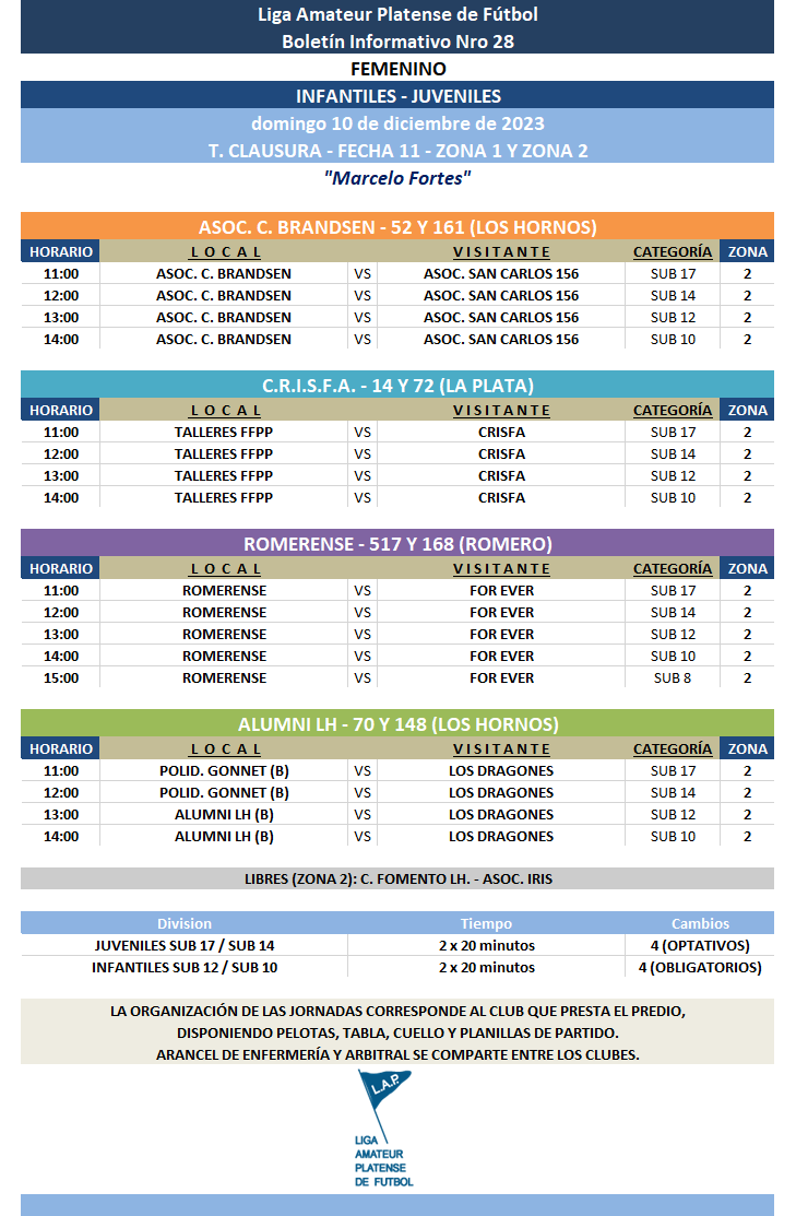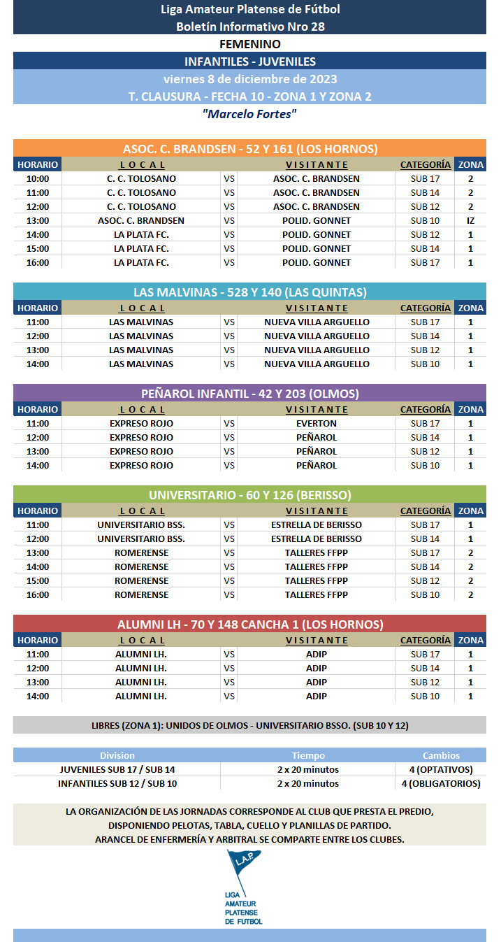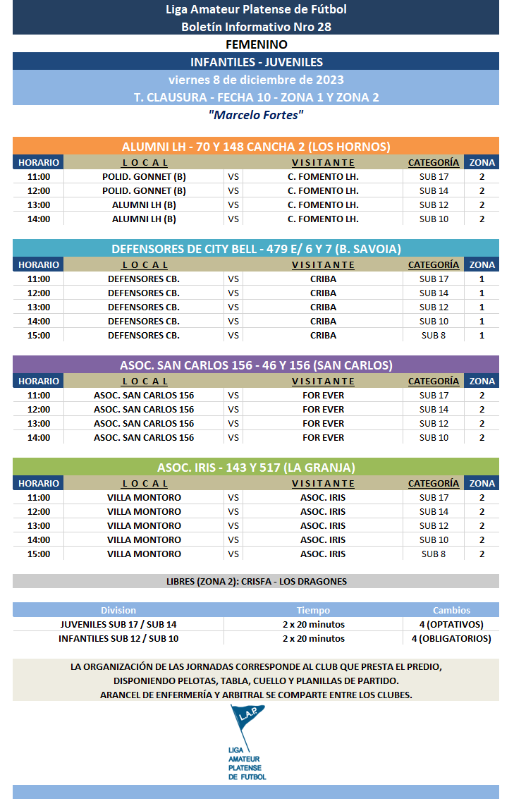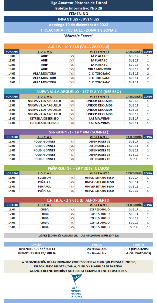 Así mismo, se anuncia la programación de la FECHA 10 y FECHA 11 de Juveniles Sub 17 y Sub 14 e Infantiles Sub 12 y Sub 10 de la Zona 1 y de la Zona 2 a disputarse los días viernes 8 y domingo 10 de diciembre, respectivamente.