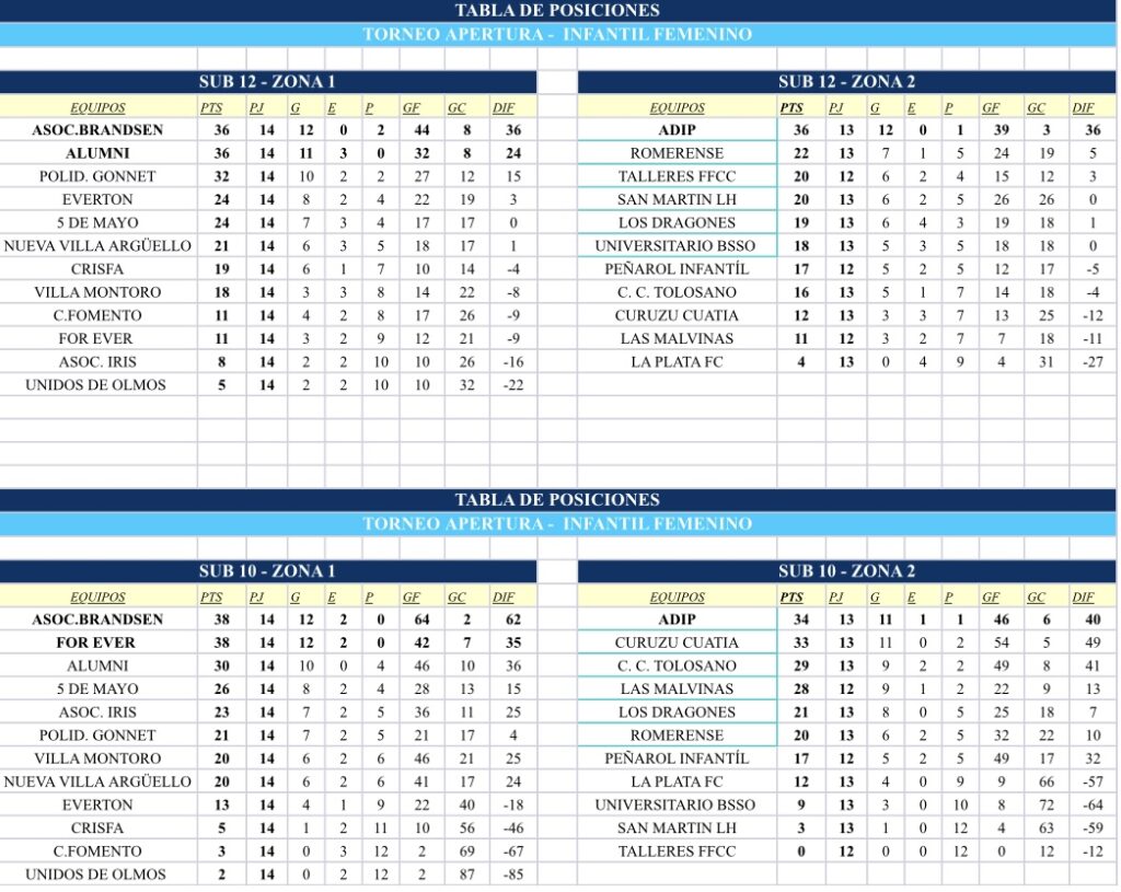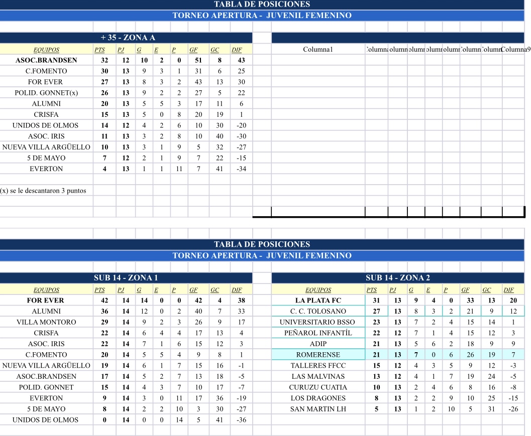 Compartimos las tablas de posiciones de las categorías Infantiles, Juveniles y +35 – Torneo Apertura 2025 Zona 1 y Zona 2: