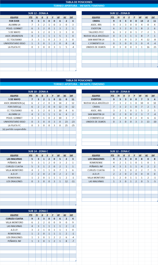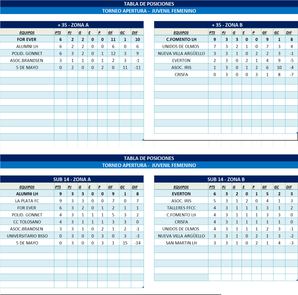 Compartimos las tablas de posiciones de las categorías Infantiles, Juveniles y +35 – Torneo Apertura 2025 Zona 1 y Zona 2: