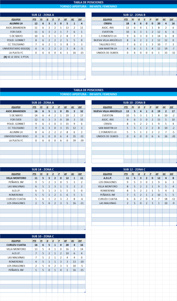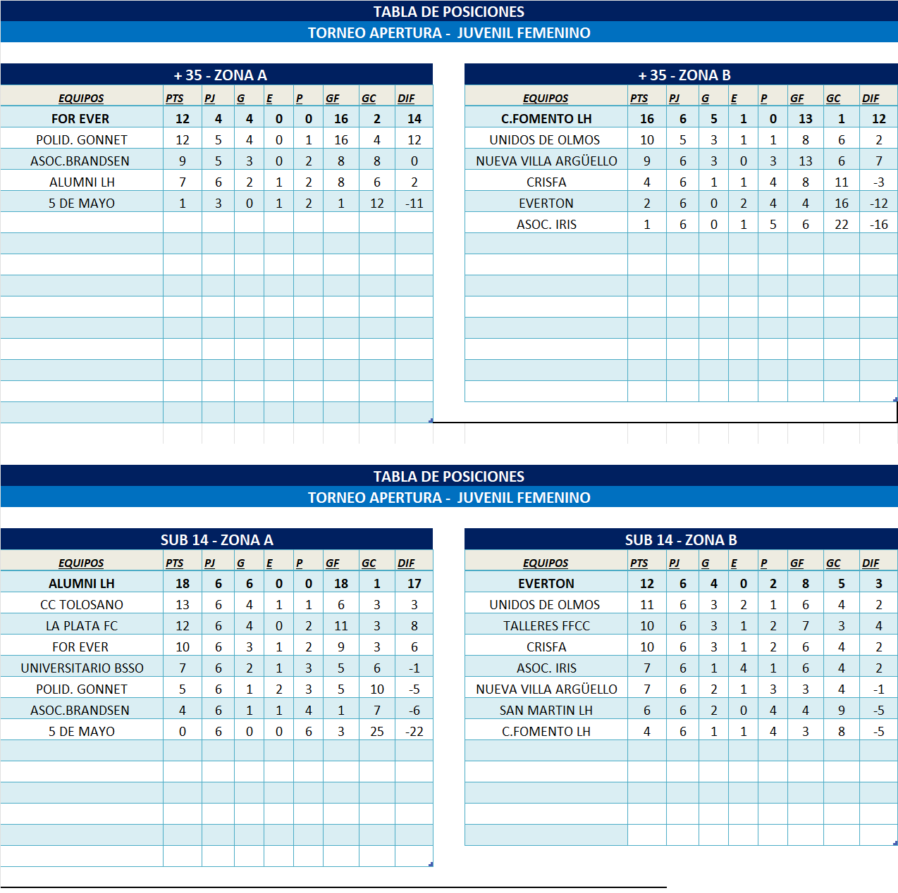 Compartimos las tablas de posiciones de las categorías Infantiles, Juveniles y +35 – Torneo Apertura 2025 Zona A, Zona B y Zona C: