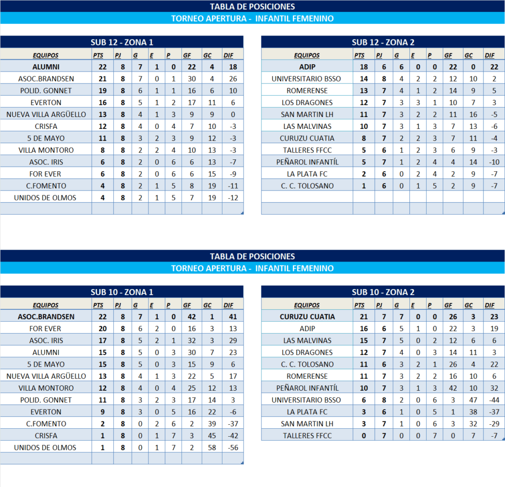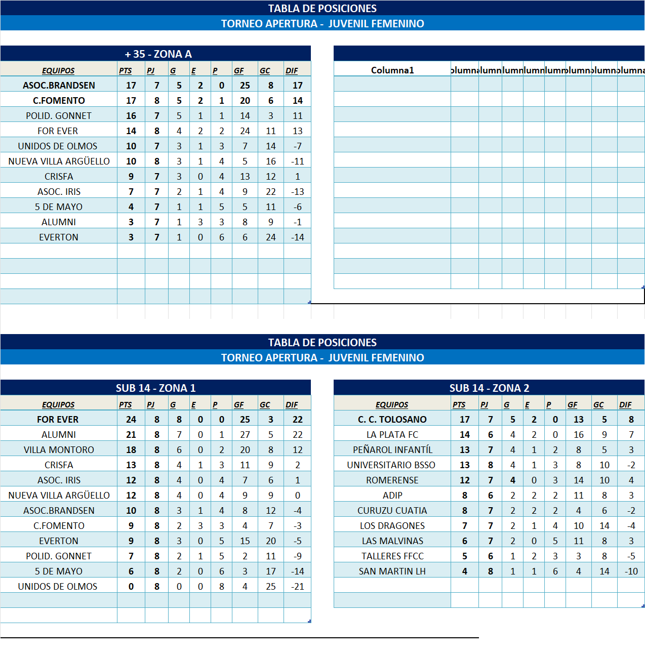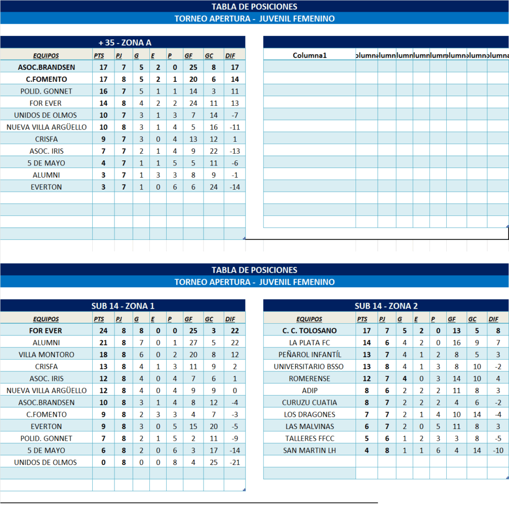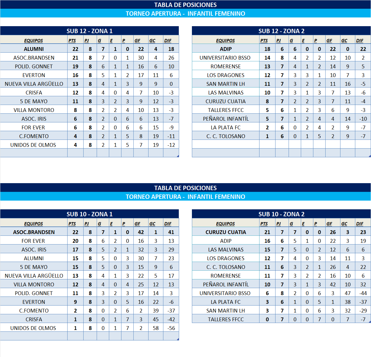 Compartimos las tablas de posiciones de las categorías Infantiles, Juveniles y +35 – Torneo Apertura 2025 Zona 1 y Zona 2: