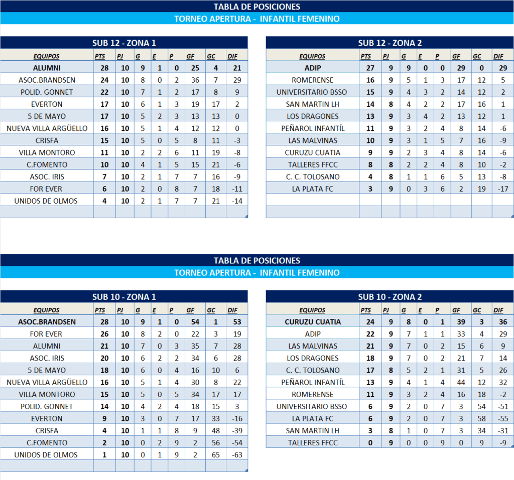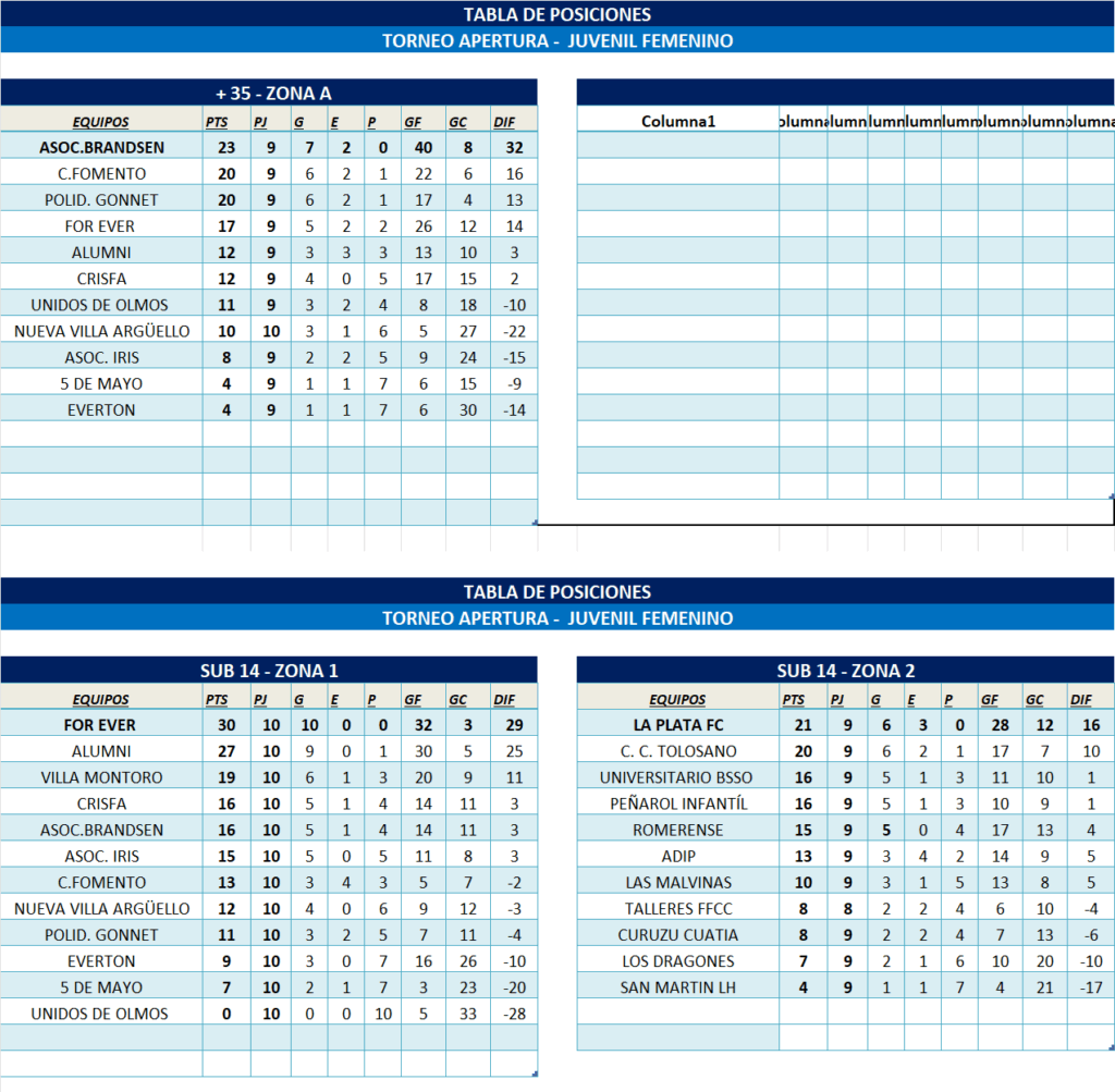 Compartimos las tablas de posiciones de las categorías Infantiles, Juveniles y +35 – Torneo Apertura 2025 Zona 1 y Zona 2:
