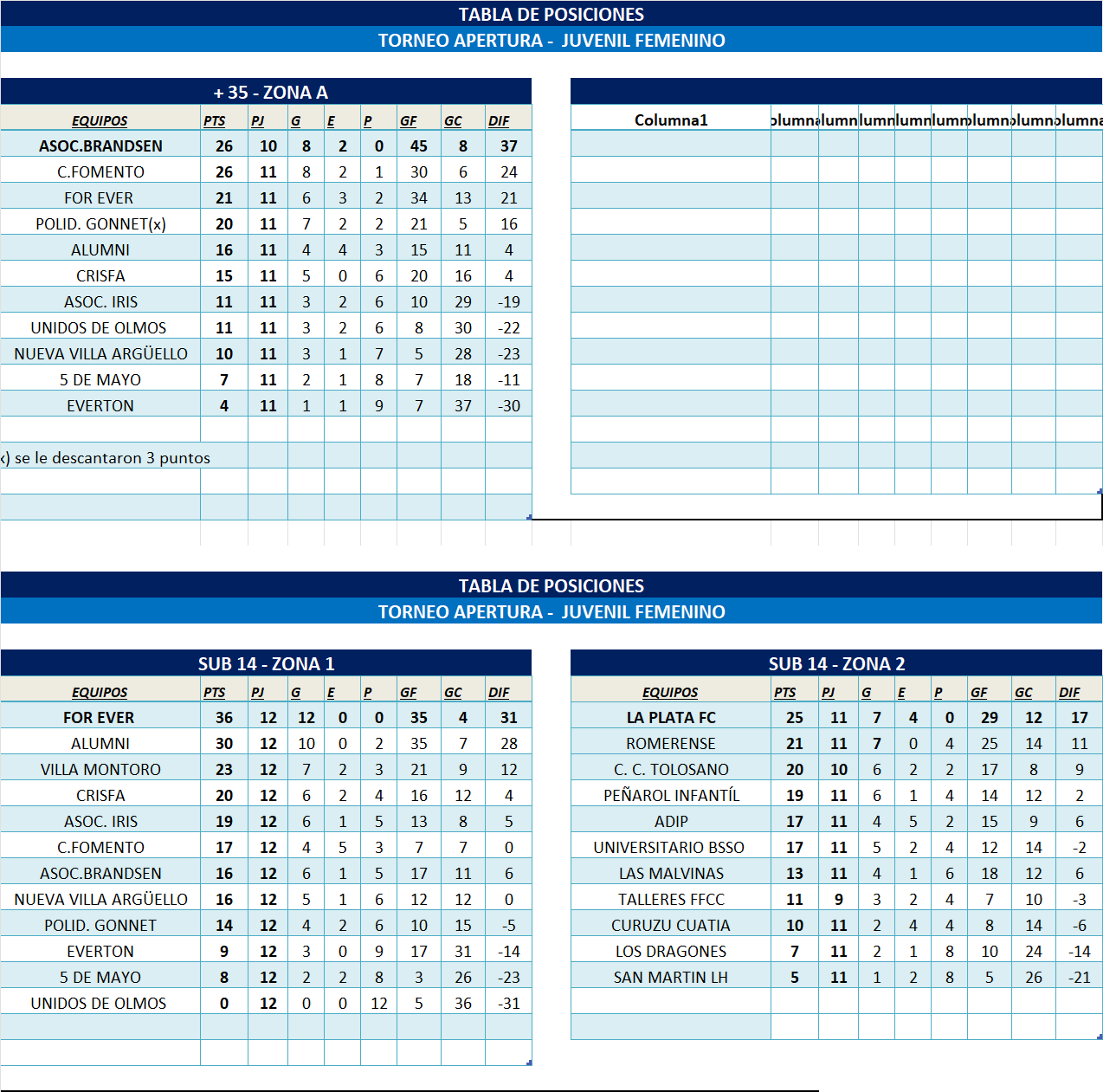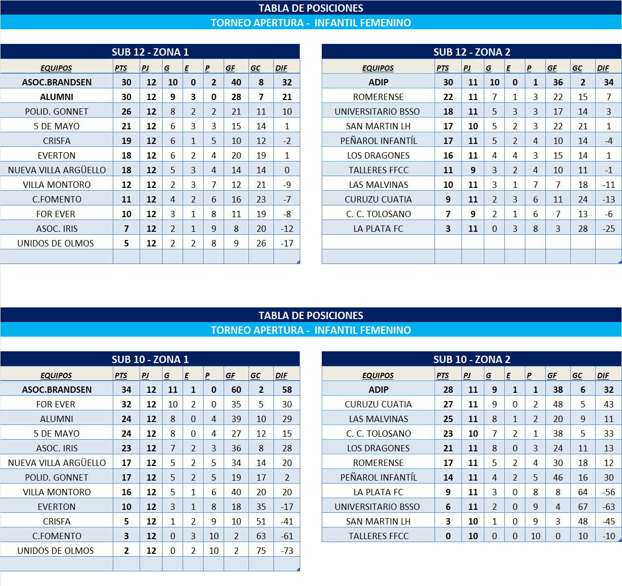 Compartimos las tablas de posiciones de las categorías Infantiles, Juveniles y +35 – Torneo Apertura 2025 Zona 1 y Zona 2: