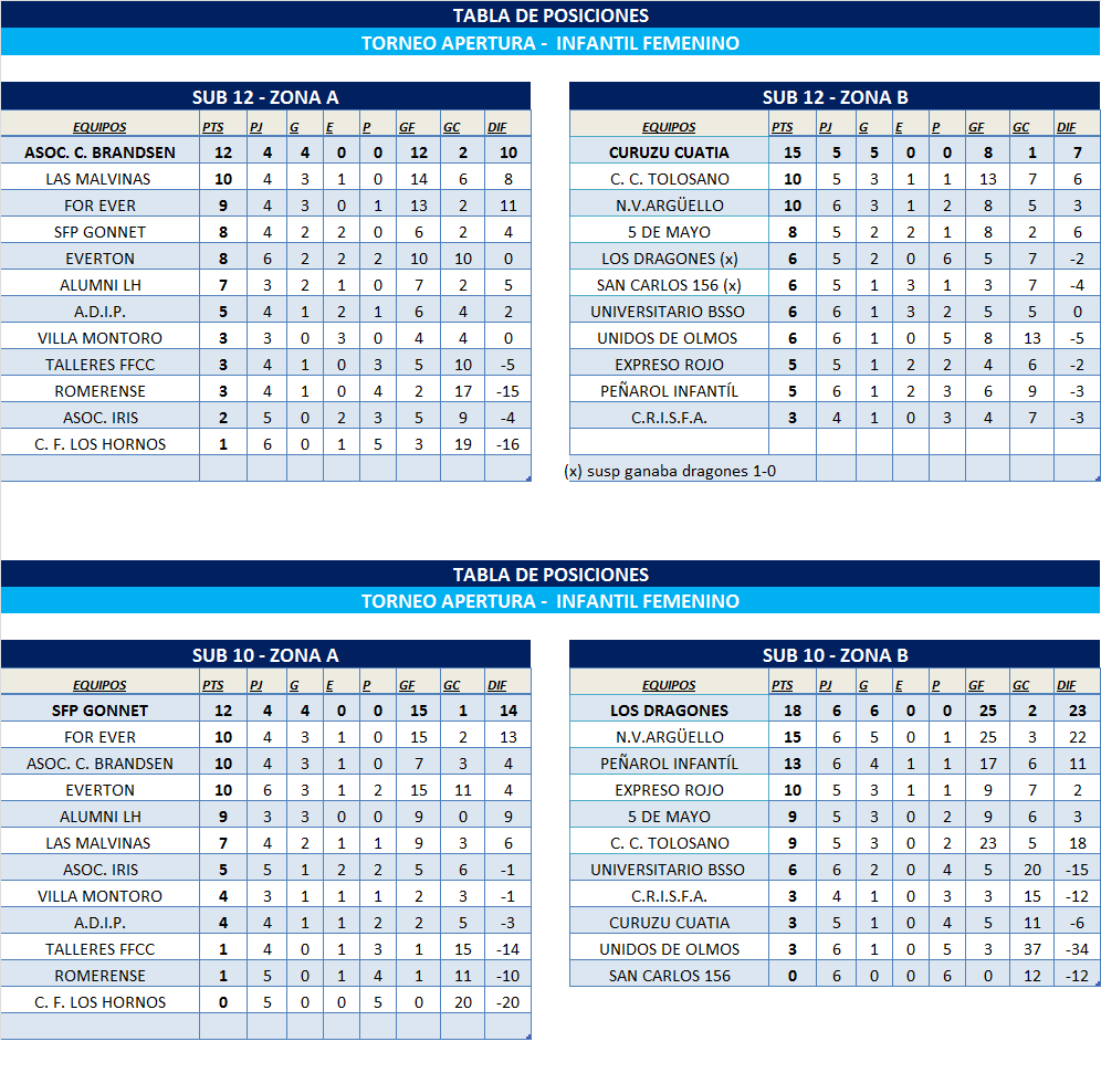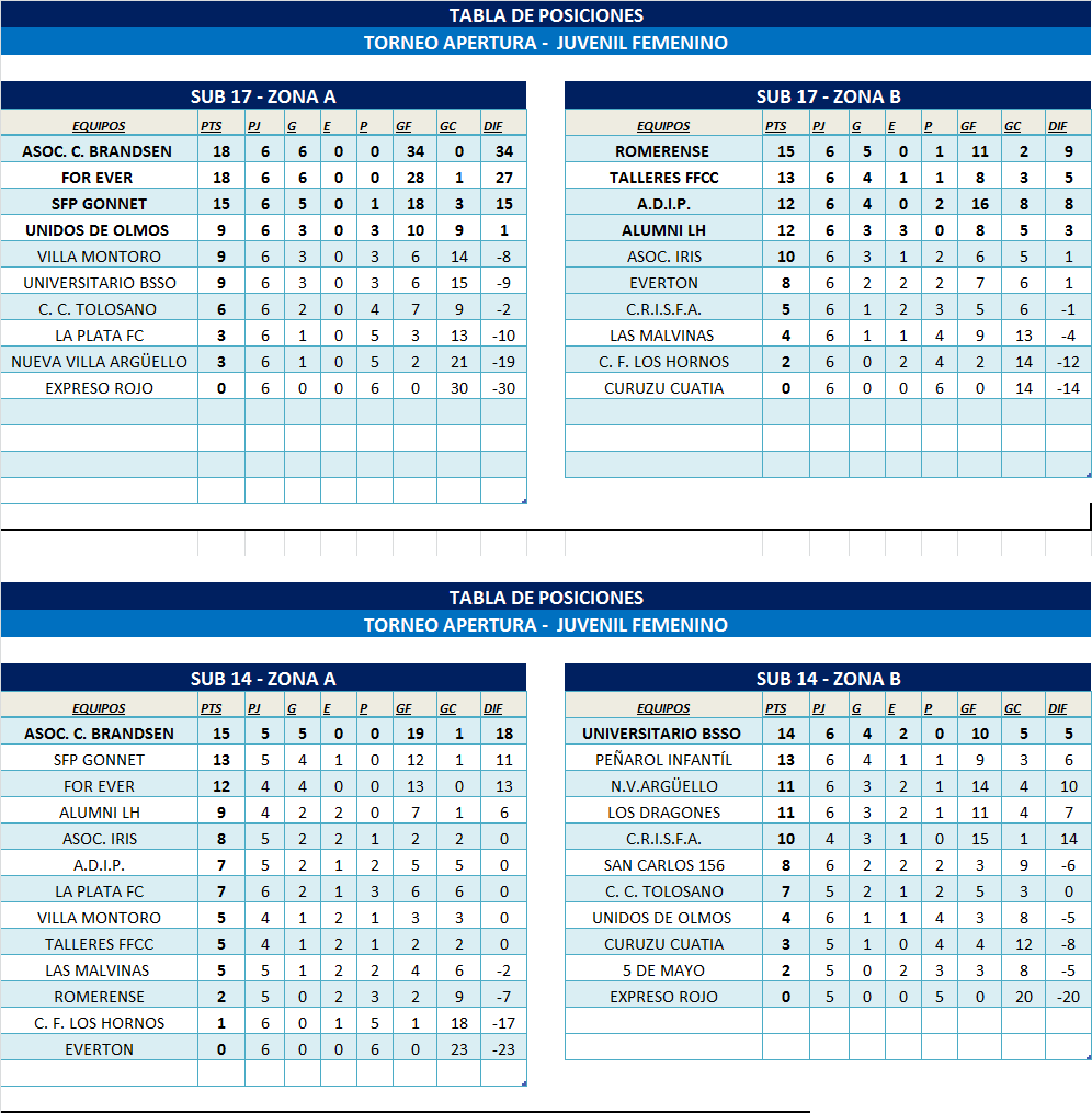 #Femenino TABLAS DE POSICIONES finalizadas las FECHA 5 y 6 – SUB 17; SUB 14; SUB 12 Y SUB 10.