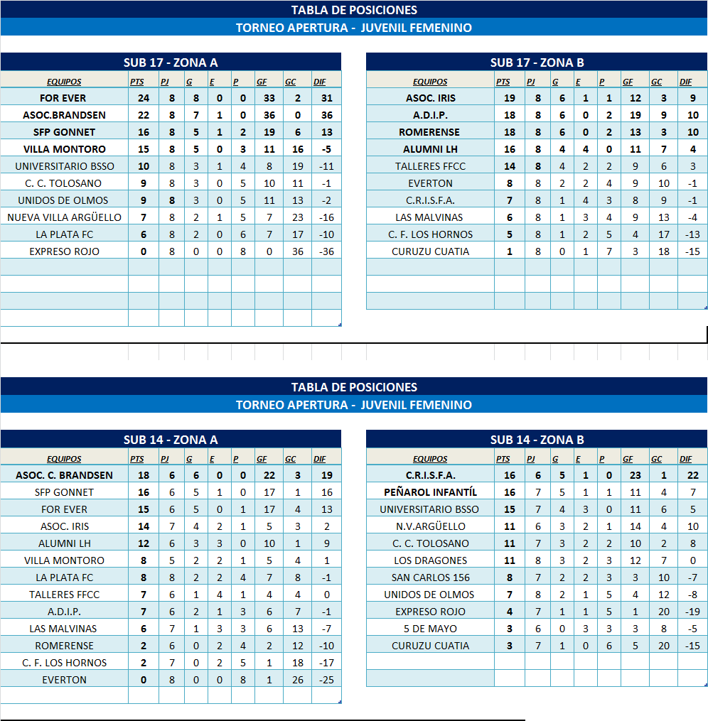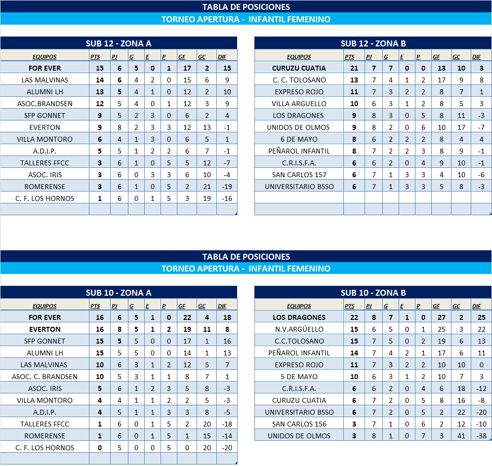 #Femenino TABLAS DE POSICIONES finalizadas las FECHA 7 y 8 – SUB 17; SUB 14; SUB 12 Y SUB 10.
