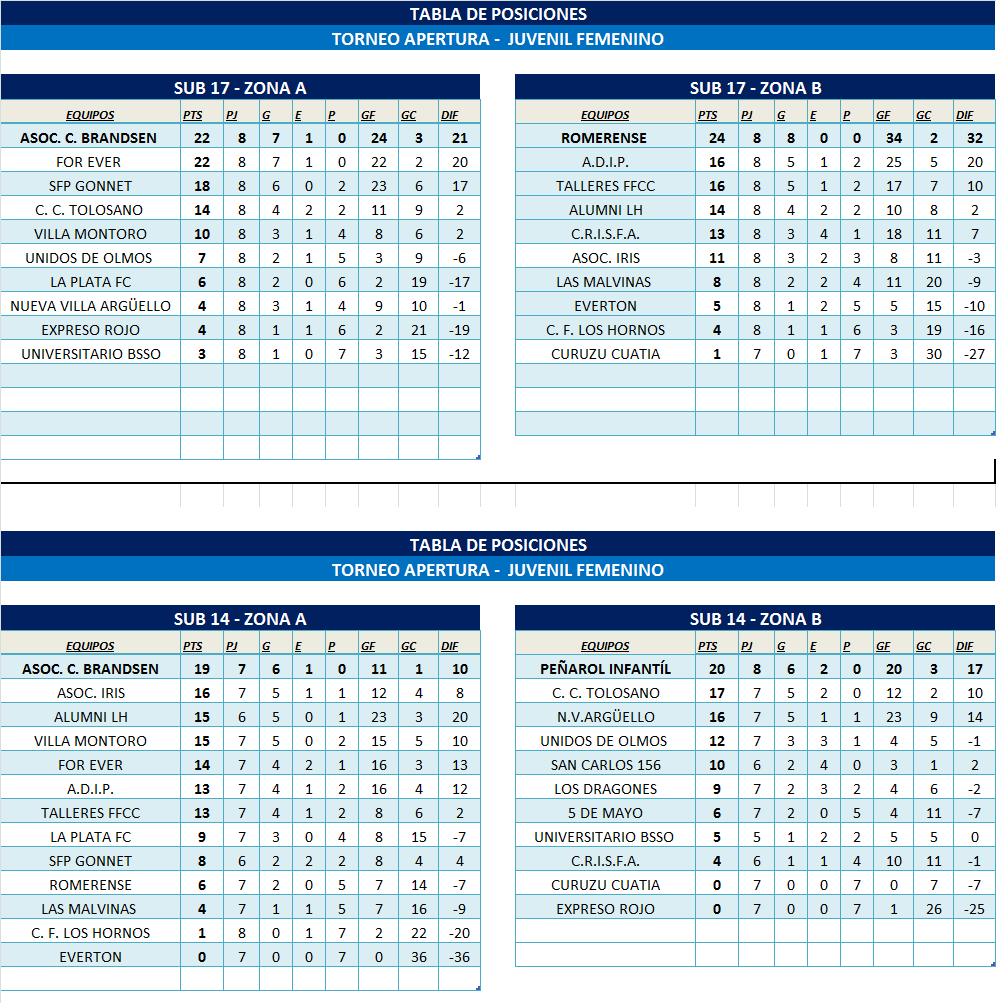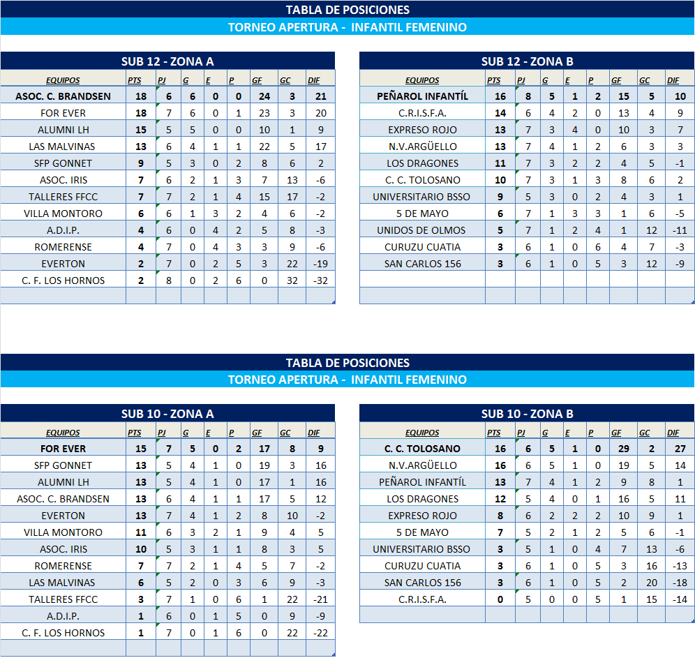 #Femenino TABLAS DE POSICIONES finalizadas la FECHA 8 – SUB 17 y la FECHA 9 – SUB 14; SUB 12 Y SUB 10.