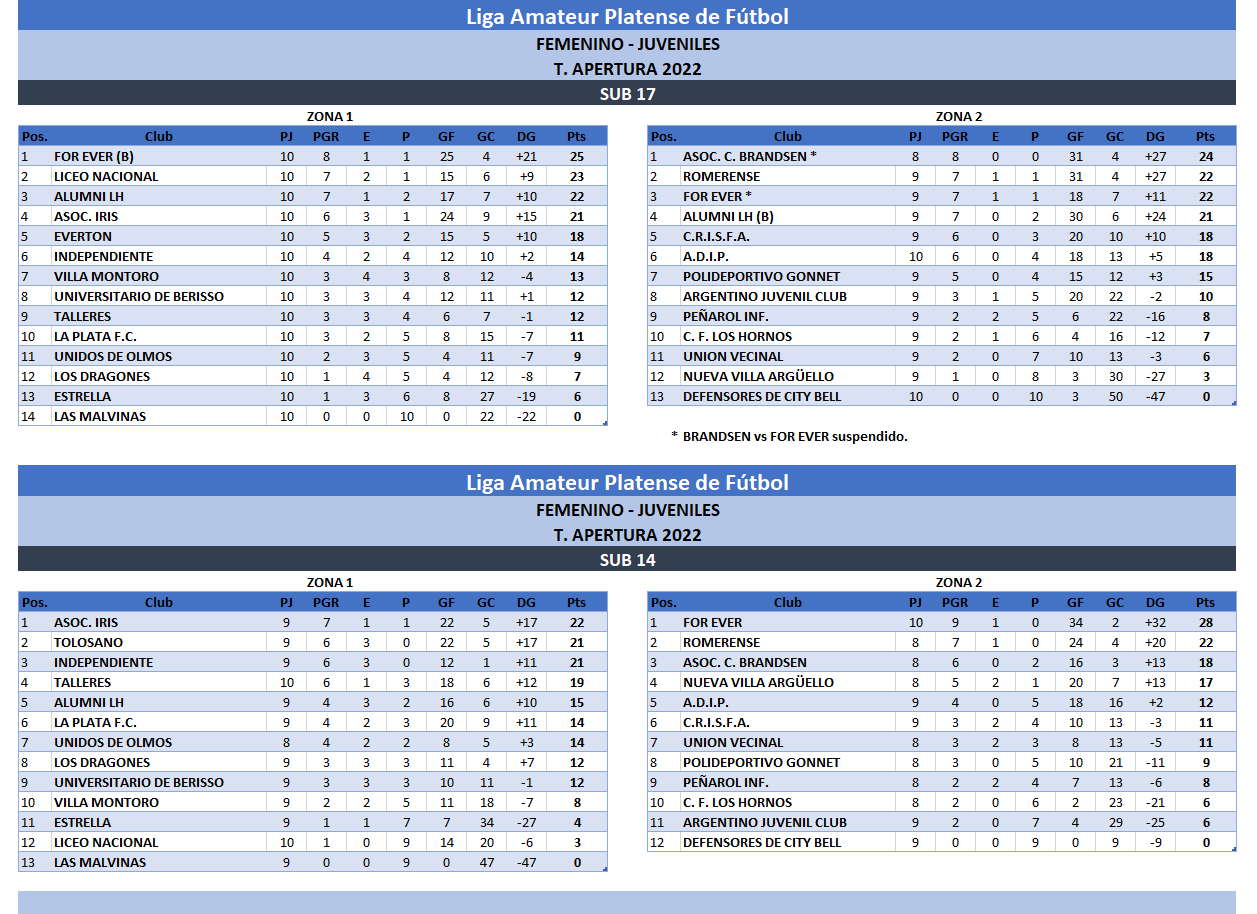 Compartimos las tablas de posiciones de las categorías Juveniles Sub 14 y Sub 17 disputada la 10MA FECHA del Torneo Apertura 2022 para Zona 1 y Zona 2: