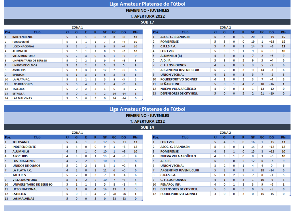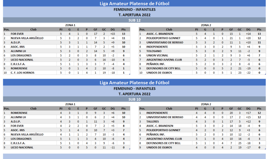 Compartimos las tablas de posiciones de las categorías Infantiles Sub 10 y Sub 12 y Juveniles Sub 14 y Sub 17 disputada la 5TA FECHA del Torneo Apertura 2022 para Zona 1 y Zona 2: