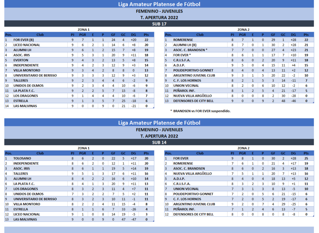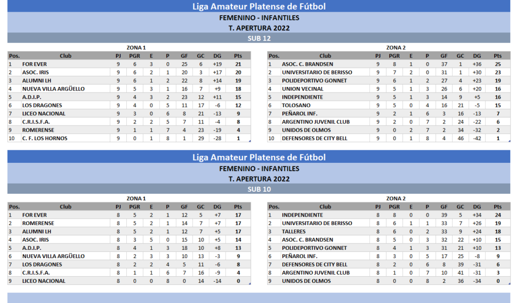 Compartimos las tablas de posiciones de las categorías Infantiles Sub 10 y Sub 12 y Juveniles Sub 14 y Sub 17 disputada la 9NA FECHA del Torneo Apertura 2022 para Zona 1 y Zona 2: