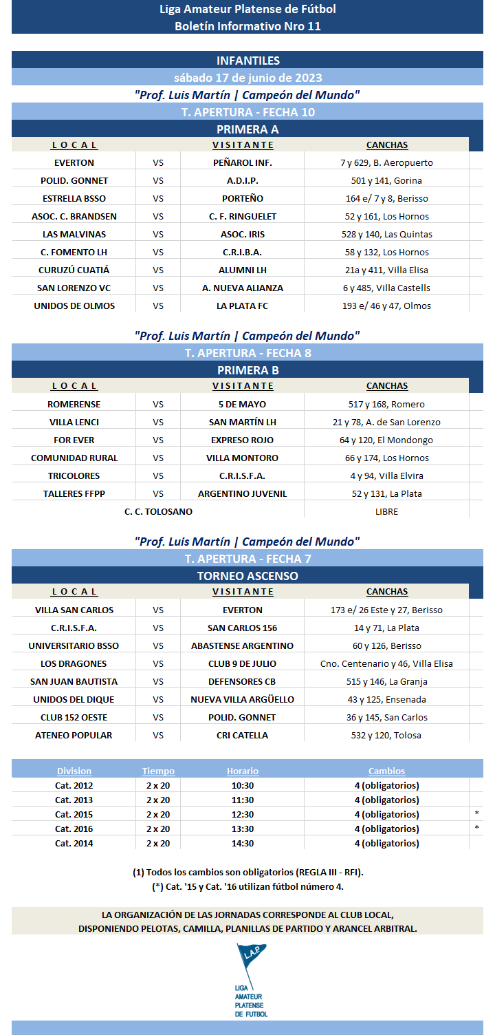 Compartimos la programación de partidos correspondientes a la FECHA 10 y a la FECHA 10 de Primera Divisional A, la FECHA 8 Y FECHA 9 de Primera Divisional B y FECHA 7 y la FECHA 8 del T. Ascenso de Fútbol Masculino del Torneo Apertura “Prof. Luis Martín | Campeón del Mundo” de la Liga Amateur Platense de Fútbol a disputarse el próximo fin de semana. *
