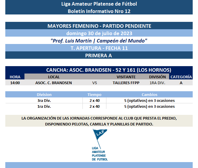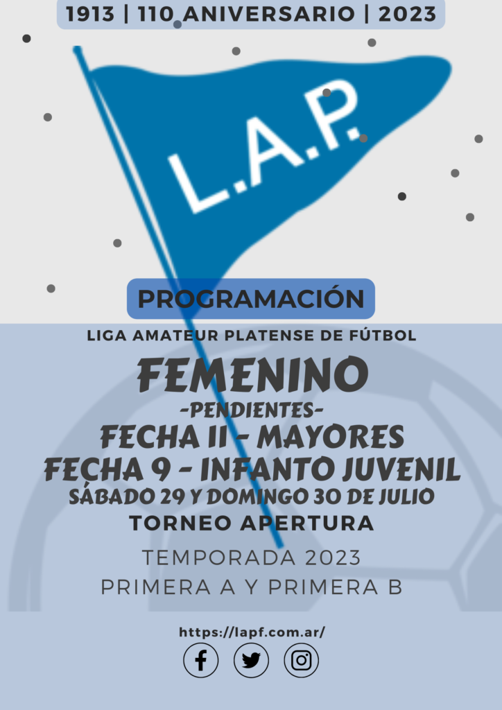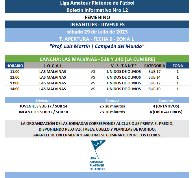 Compartimos la programación de partidos pendientes de la FECHA 11 del T. Apertura de Primera Divisional A de Fútbol Femenino “Prof. Luis Martín | Campeón del Mundo” y de la FECHA 9 del campeonato Apertura de Juveniles Sub 17 y Sub 14 e Infantiles Sub 12 y Sub 10 de la Zona 1 a disputarse el próximo fin de semana.