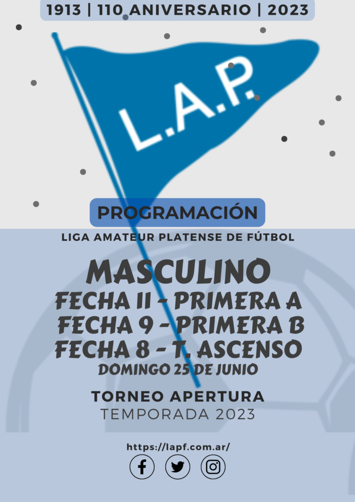 Compartimos la programación de partidos correspondientes a la FECHA 10 y a la FECHA 10 de Primera Divisional A, la FECHA 8 Y FECHA 9 de Primera Divisional B y FECHA 7 y la FECHA 8 del T. Ascenso de Fútbol Masculino del Torneo Apertura “Prof. Luis Martín | Campeón del Mundo” de la Liga Amateur Platense de Fútbol a disputarse el próximo fin de semana. *