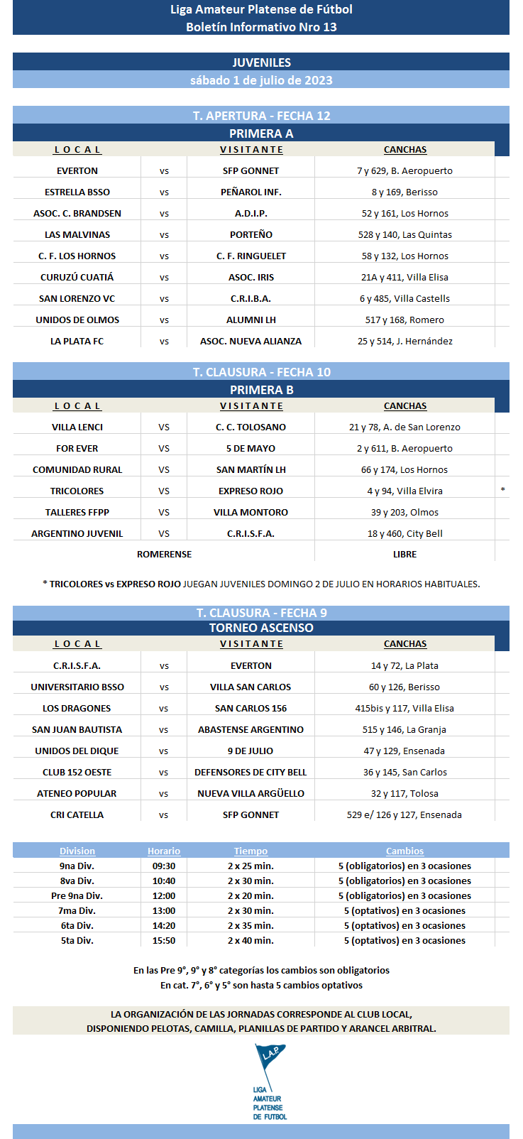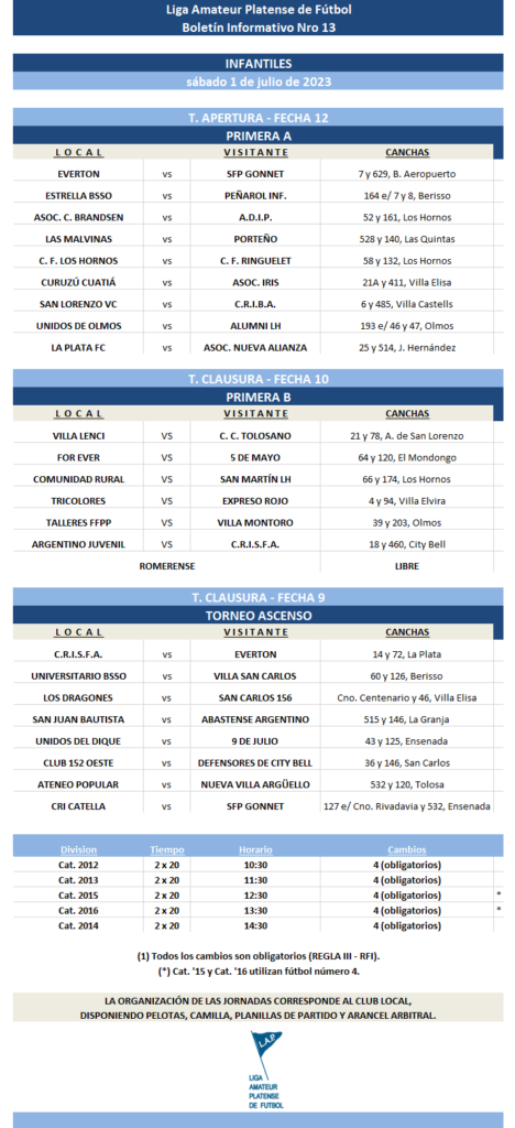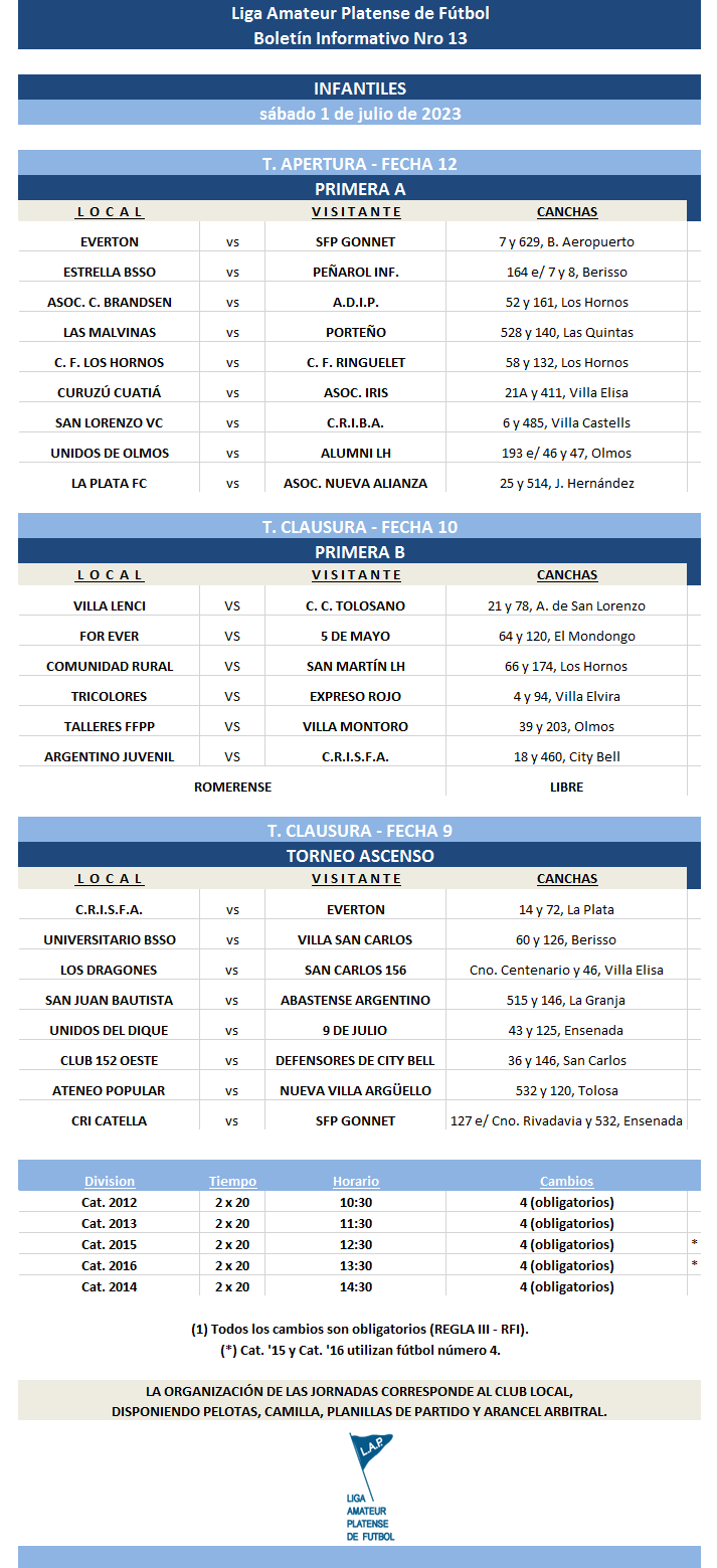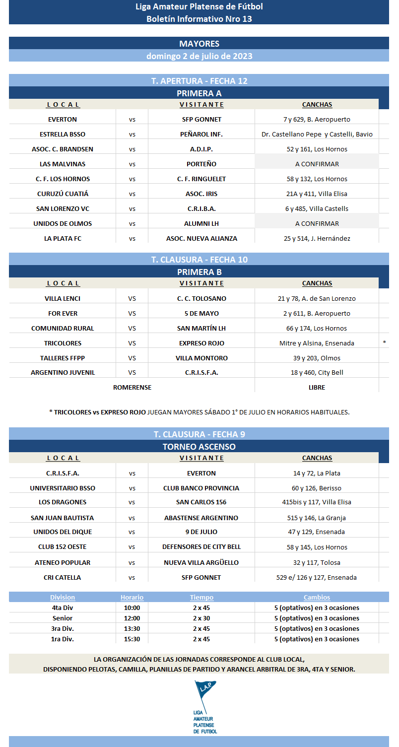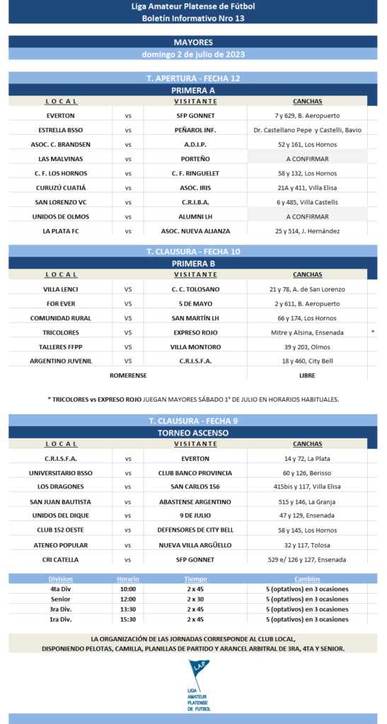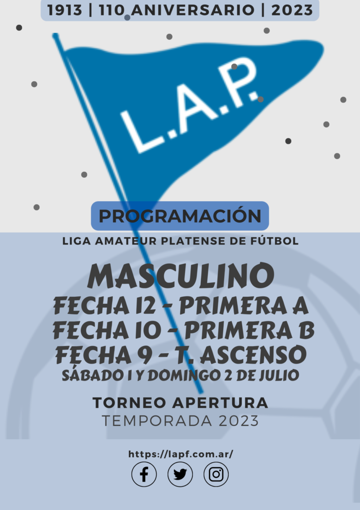 Compartimos la programación de partidos correspondientes a la FECHA 12 de Primera Divisional A, la FECHA 10 de Primera Divisional B y FECHA 9 del T. Ascenso de Fútbol Masculino del Torneo Apertura “Prof. Luis Martín | Campeón del Mundo” de la Liga Amateur Platense de Fútbol a disputarse el próximo fin de semana. *