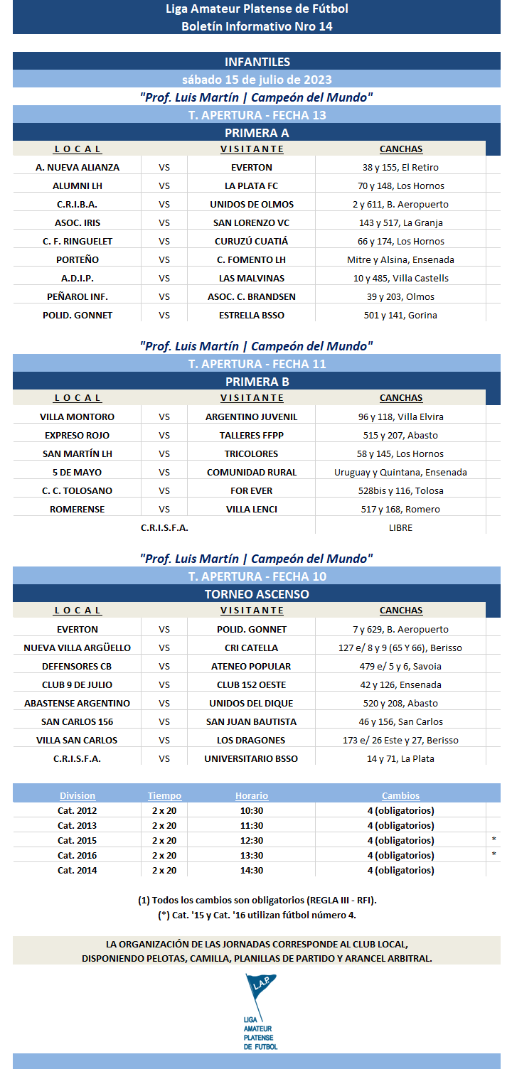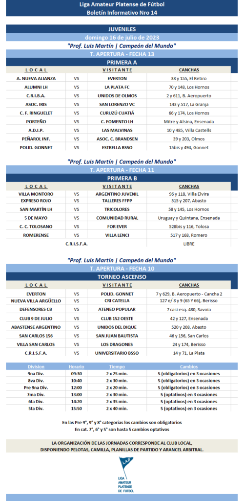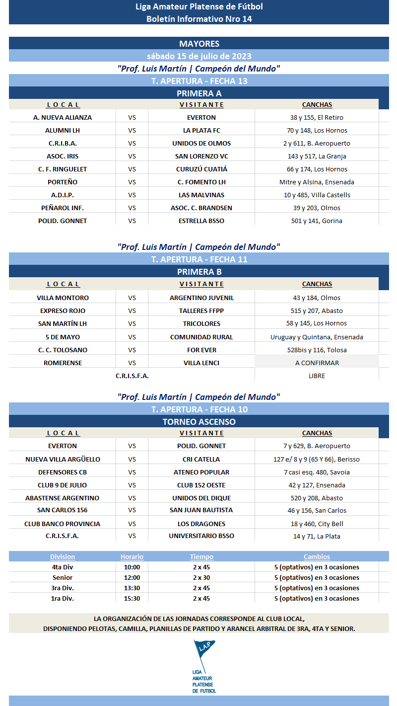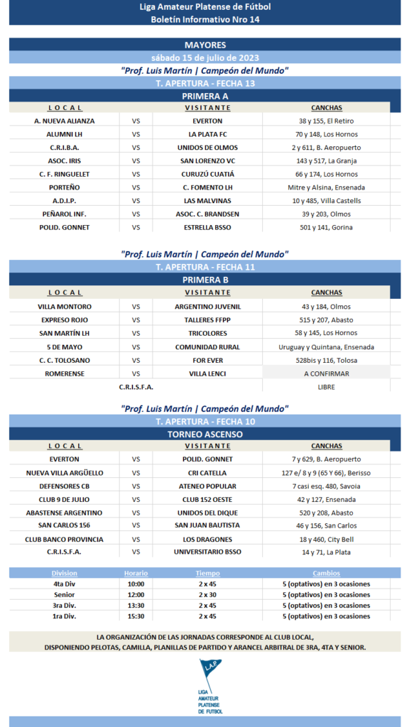 Compartimos la programación de partidos correspondientes a la FECHA 13 de Primera Divisional A, la FECHA 11 de Primera Divisional B y la FECHA 10 del T. Ascenso de Fútbol Masculino del Torneo Apertura “Prof. Luis Martín | Campeón del Mundo” de la Liga Amateur Platense de Fútbol a disputarse el próximo fin de semana. *