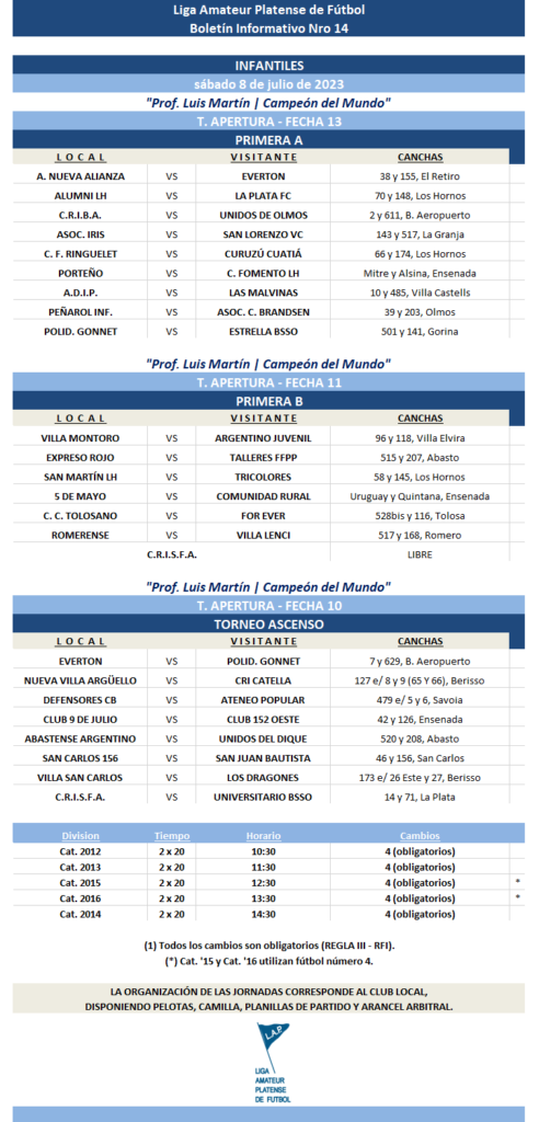 * ATENCIÓN: En virtud de la resuelto por el Comité Ejecutivo, el Área Deportiva comunica que esta será la última programación con calendario completo de competencia para infantiles, juveniles y mayores. A partir del próximo fin de semana se jugarán únicamente los cotejos correspondientes de categorías Mayores. Durante el receso escolar – periodo de vacaciones de invierno – no se disputarán jornadas de infantiles y juveniles, a excepción de los partidos suspendidos y/o pendientes del Torneo Apertura previstos para el sábado 15 y domingo 16 de julio. El campeonato de infantiles y juveniles se reanudará el sábado 29 y domingo 30 de julio con la fecha de Primera A, Primera B y T. Ascenso que correspondiere a categorías Mayores.
