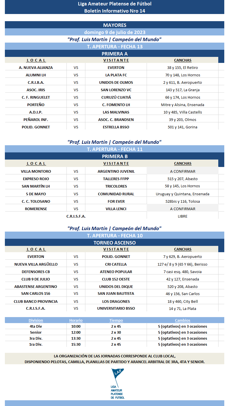 Compartimos la programación de partidos correspondientes a la FECHA 13 de Primera Divisional A, la FECHA 11 de Primera Divisional B y la FECHA 10 del T. Ascenso de Fútbol Masculino del Torneo Apertura “Prof. Luis Martín | Campeón del Mundo” de la Liga Amateur Platense de Fútbol a disputarse el próximo fin de semana. *