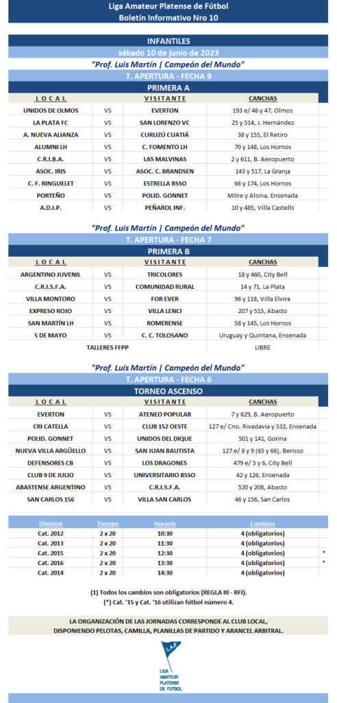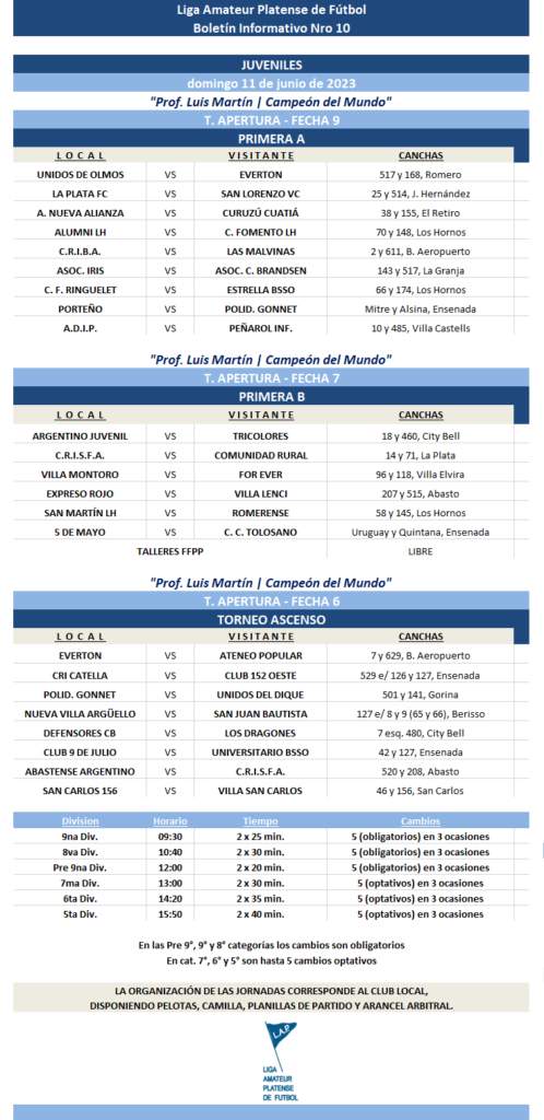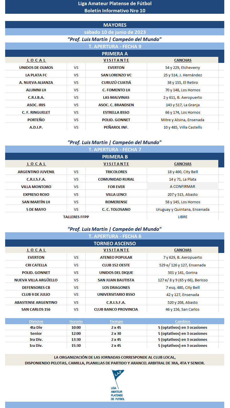Compartimos la programación de partidos correspondiente a la FECHA 9 de Primera Divisional A, la FECHA 7 de Primera Divisional B y FECHA 6 del T. Ascenso de Fútbol Masculino del Torneo Apertura “Prof. Luis Martín | Campeón del Mundo” de la Liga Amateur Platense de Fútbol a disputarse el próximo fin de semana.