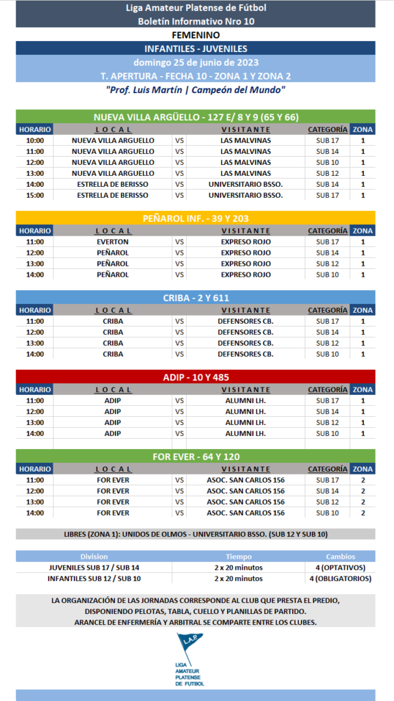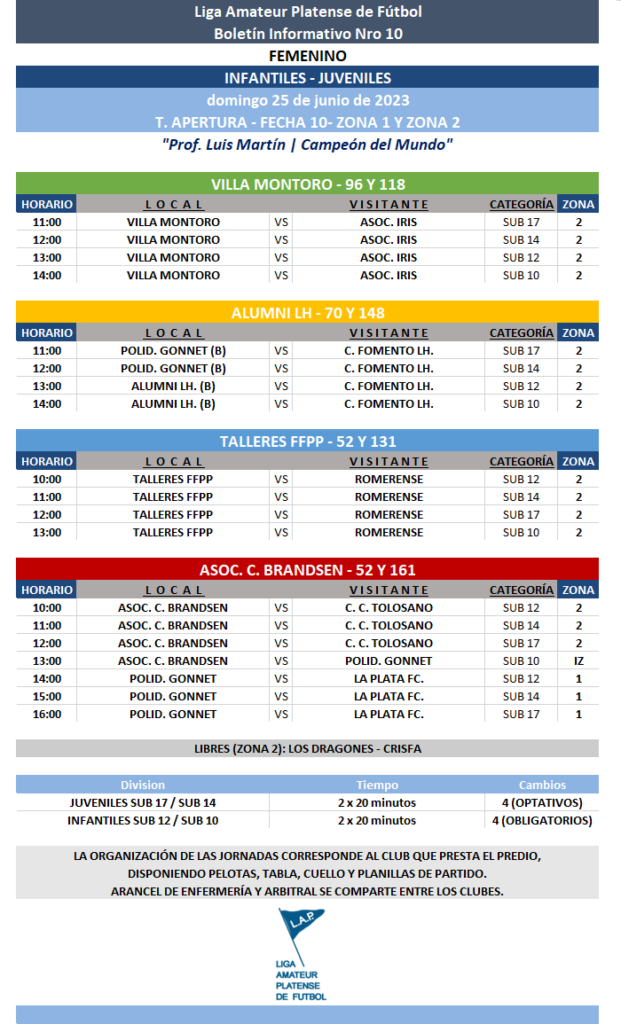 Compartimos la programación de partidos correspondientes a la FECHA 10 del T. Apertura de Fútbol Femenino “Prof. Luis Martín | Campeón del Mundo” de Juveniles Sub 17 y Sub 14 e Infantiles Sub 12 y Sub 10 de la Zona 1 y de la Zona 2 a disputarse el próximo fin de semana.