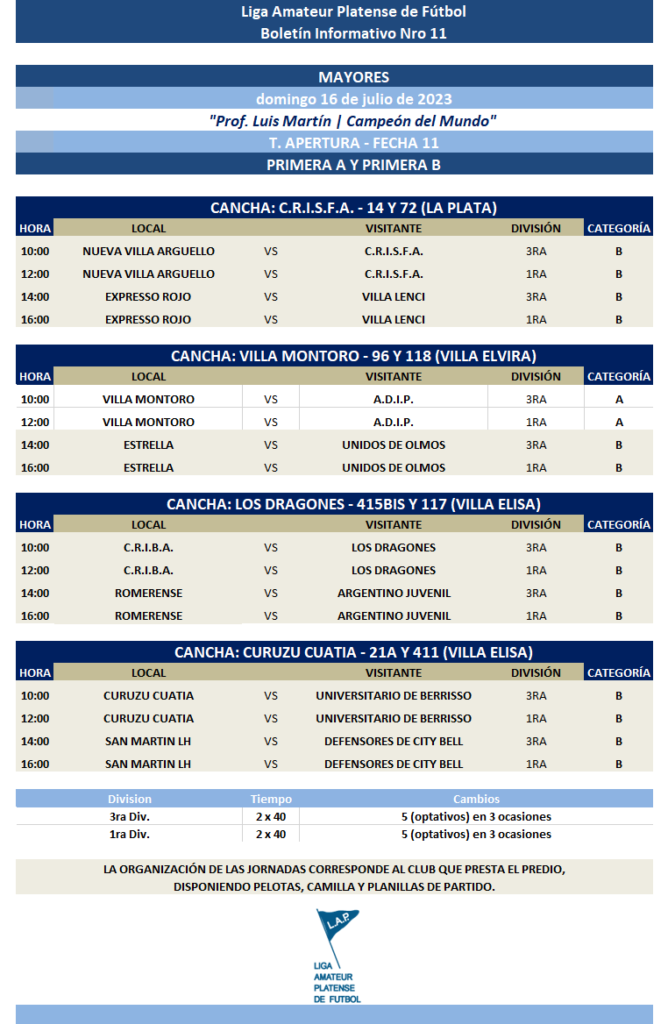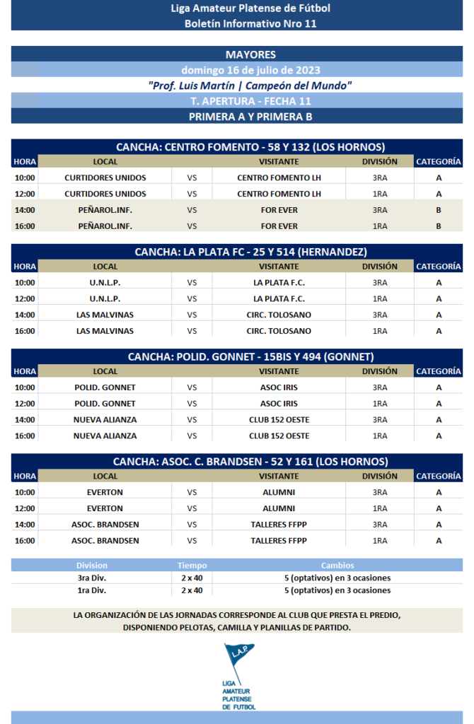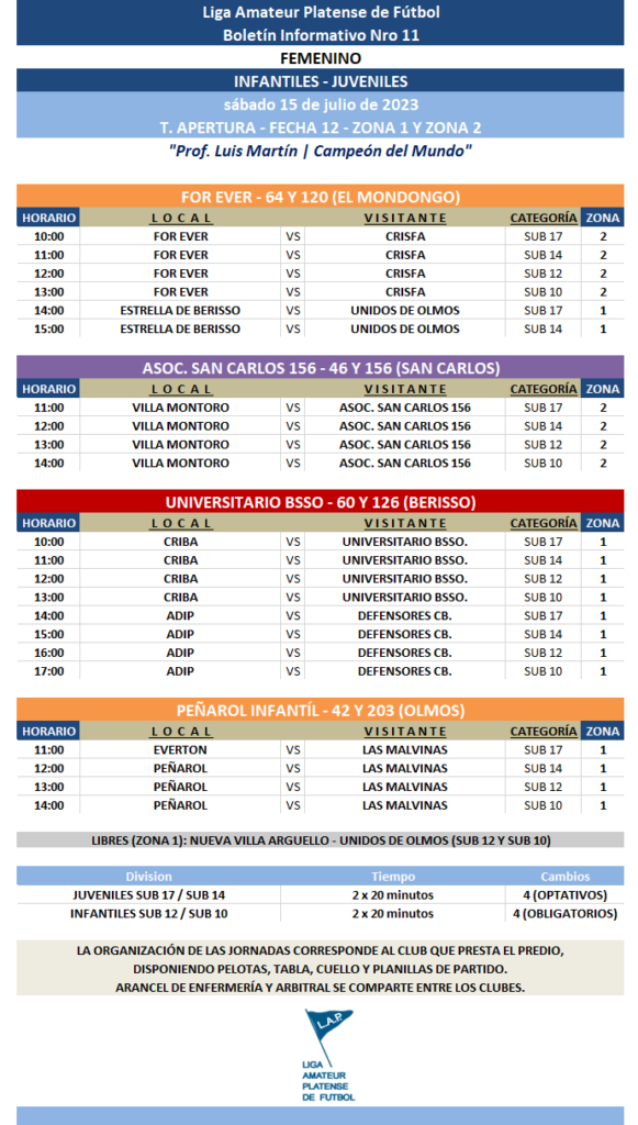 * ATENCIÓN: El Departamento de Fútbol Femenino comunica que esta será la última programación con calendario completo de competencia para infantiles, juveniles y mayores. Durante el receso escolar – periodo de vacaciones de invierno – no se disputará jornada alguna, a excepción de los partidos suspendidos y/o pendientes del Torneo Apertura de infanto – juvenil previstos para el sábado 29 y domingo 30 de julio. El campeonato de infantiles, juveniles y mayores se reanudará el sábado 5 y domingo 6 de agosto con la fecha correspondiente de Primera A y Primera B (Mayores) y del Torneo Apertura de fútbol infantil – juvenil.
