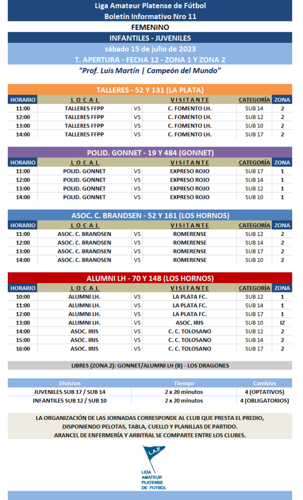 Compartimos la programación de partidos correspondientes a la FECHA 11 del T. Apertura de Primera Divisional A y de Primera Divisional B de Fútbol Femenino “Prof. Luis Martín | Campeón del Mundo” y a la FECHA 12 del campeonato Apertura de Juveniles Sub 17 y Sub 14 e Infantiles Sub 12 y Sub 10 de la Zona 1 y de la Zona 2 a disputarse el próximo fin de semana.*