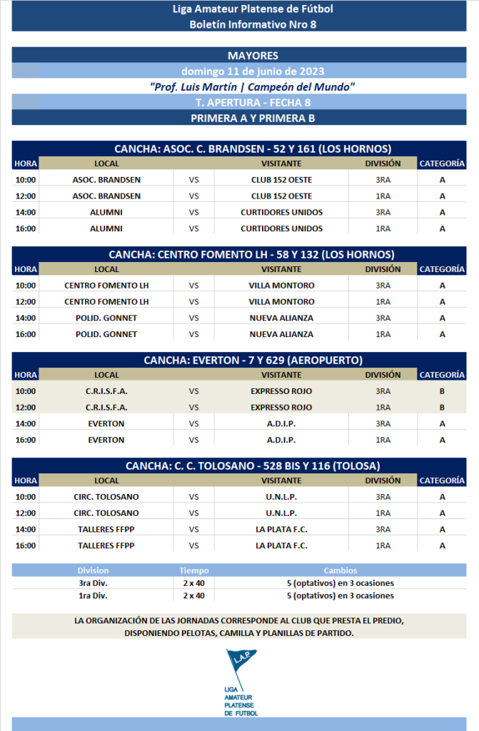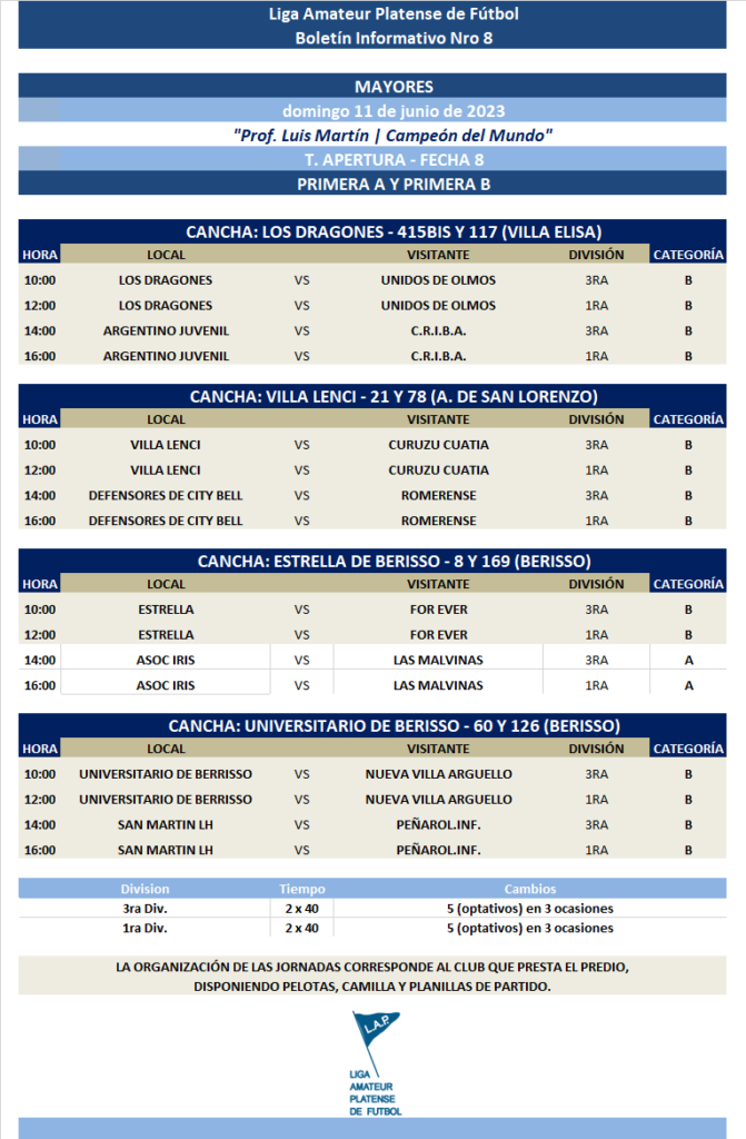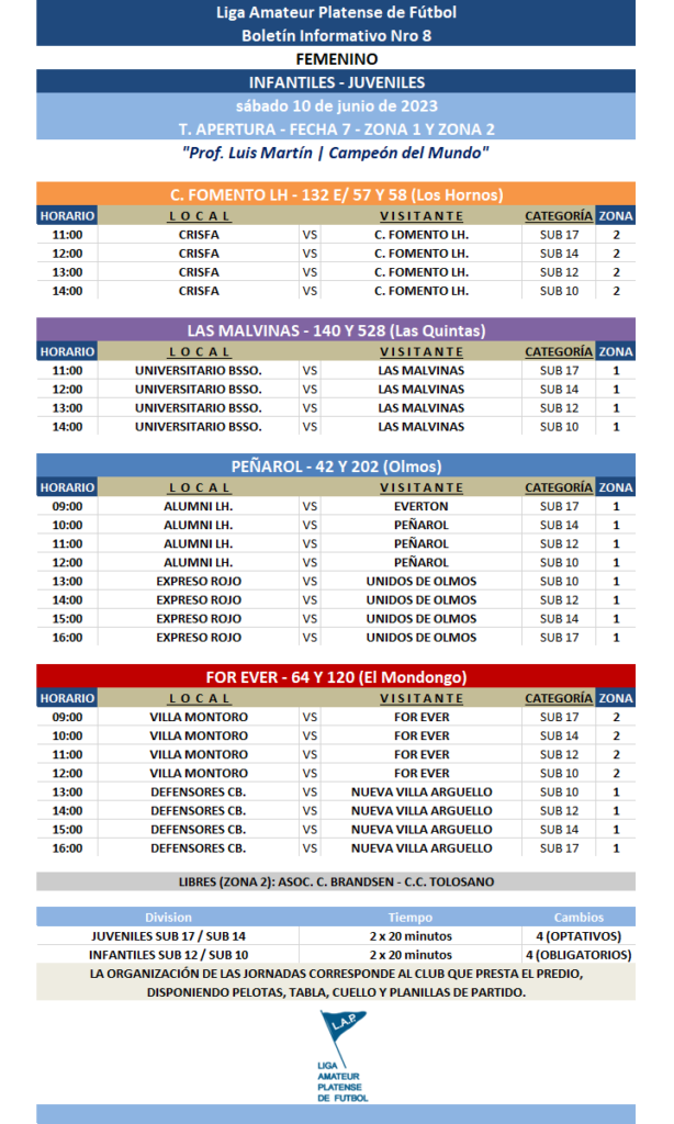 Compartimos la programación de partidos correspondientes a la FECHA 8 del T. Apertura de Primera Divisional A y de Primera Divisional B de Fútbol Femenino “Prof. Luis Martín | Campeón del Mundo” y a la FECHA 7 del campeonato Apertura de Juveniles Sub 17 y Sub 14 e Infantiles Sub 12 y Sub 10 de la Zona 1 y de la Zona 2 a disputarse el próximo fin de semana.