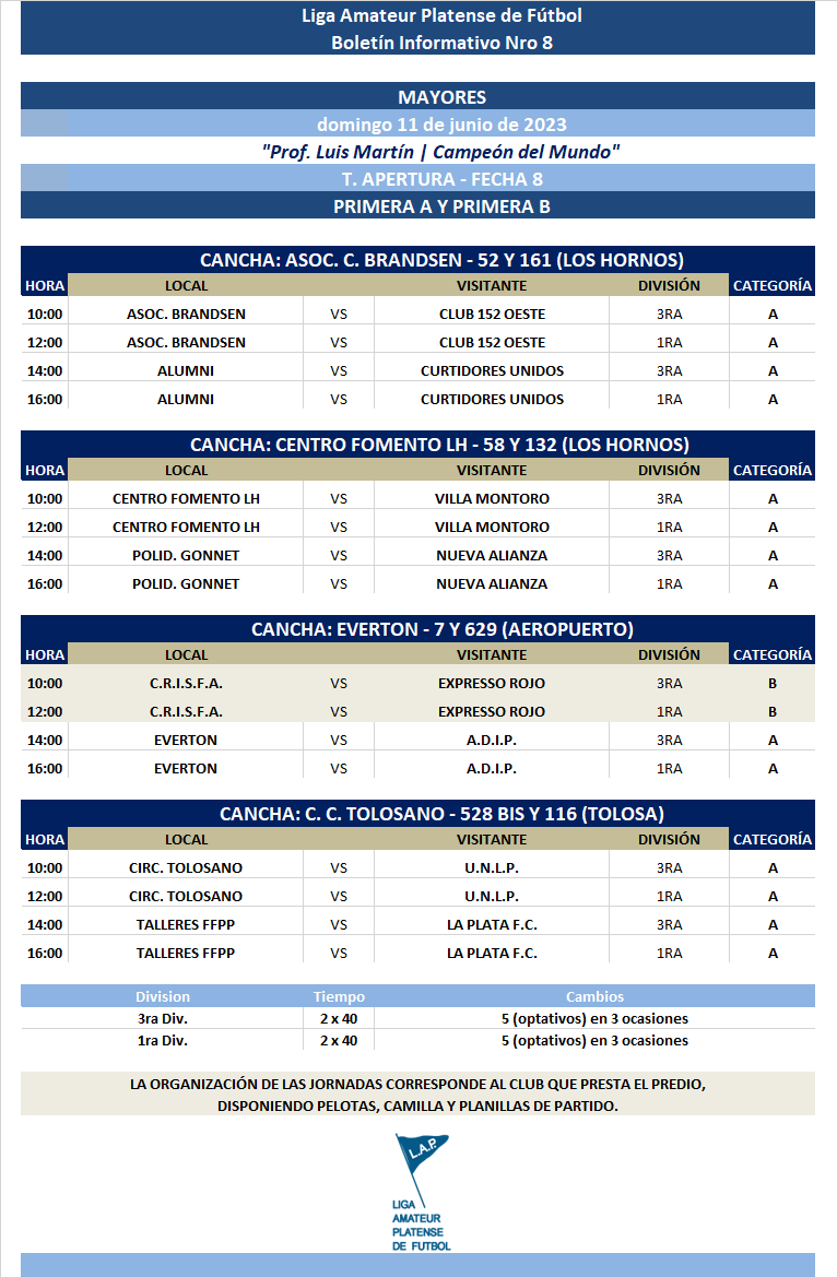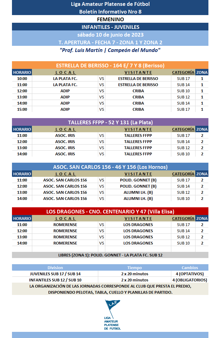Compartimos la programación de partidos correspondientes a la FECHA 8 del T. Apertura de Primera Divisional A y de Primera Divisional B de Fútbol Femenino “Prof. Luis Martín | Campeón del Mundo” y a la FECHA 7 del campeonato Apertura de Juveniles Sub 17 y Sub 14 e Infantiles Sub 12 y Sub 10 de la Zona 1 y de la Zona 2 a disputarse el próximo fin de semana.