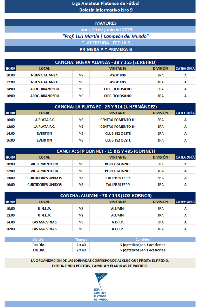 * ACLARACIÓN: En ocasión de conmemorarse el Día del Padre, el próximo domingo 18 de junio no se programará actividad alguna de fútbol masculino y femenino.