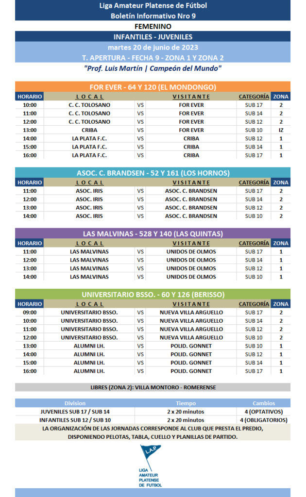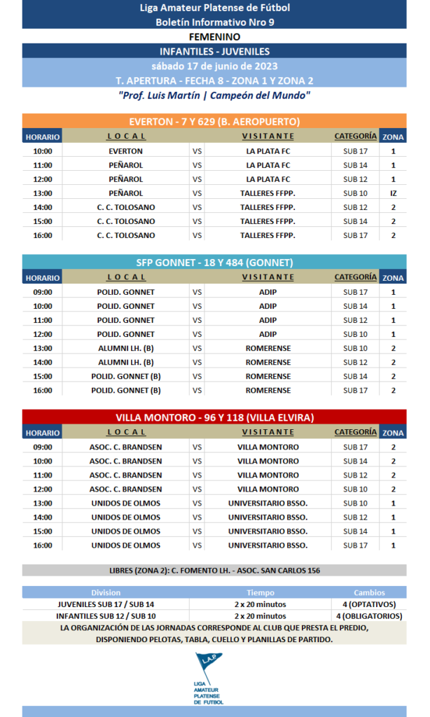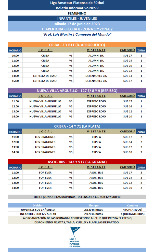 Compartimos la programación de partidos correspondientes a la FECHA 9 del T. Apertura de Primera Divisional A y de Primera Divisional B de Fútbol Femenino “Prof. Luis Martín | Campeón del Mundo” y a la FECHA 8 Y FECHA 9 del campeonato Apertura de Juveniles Sub 17 y Sub 14 e Infantiles Sub 12 y Sub 10 de la Zona 1 y de la Zona 2 a disputarse el próximo fin de semana. *