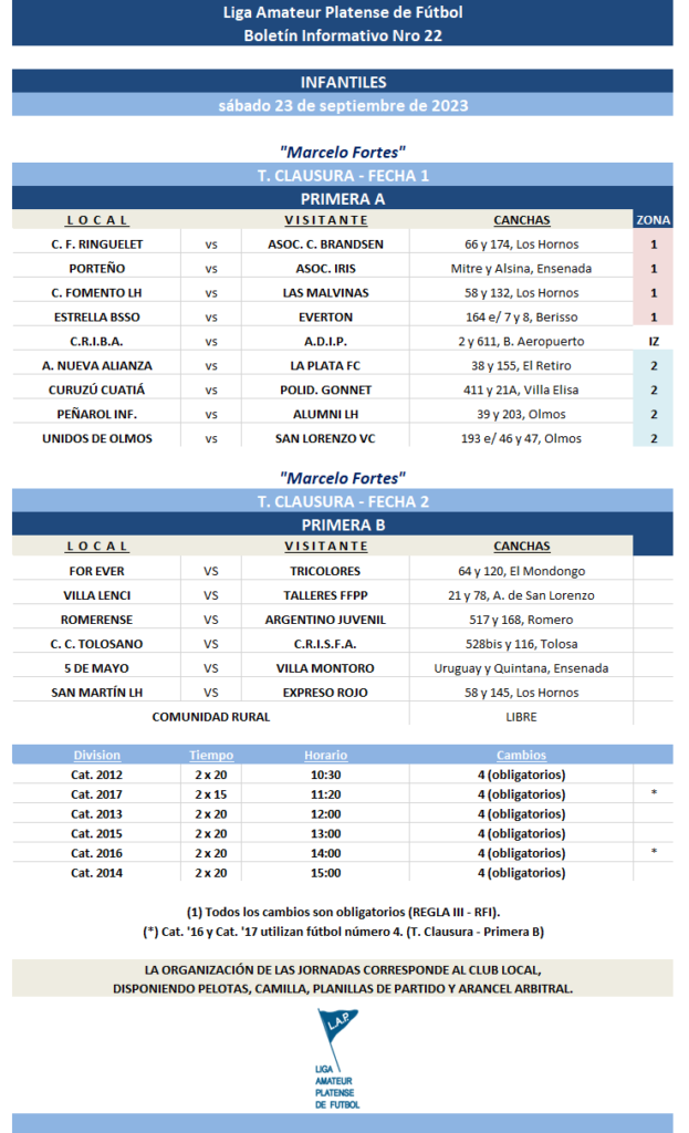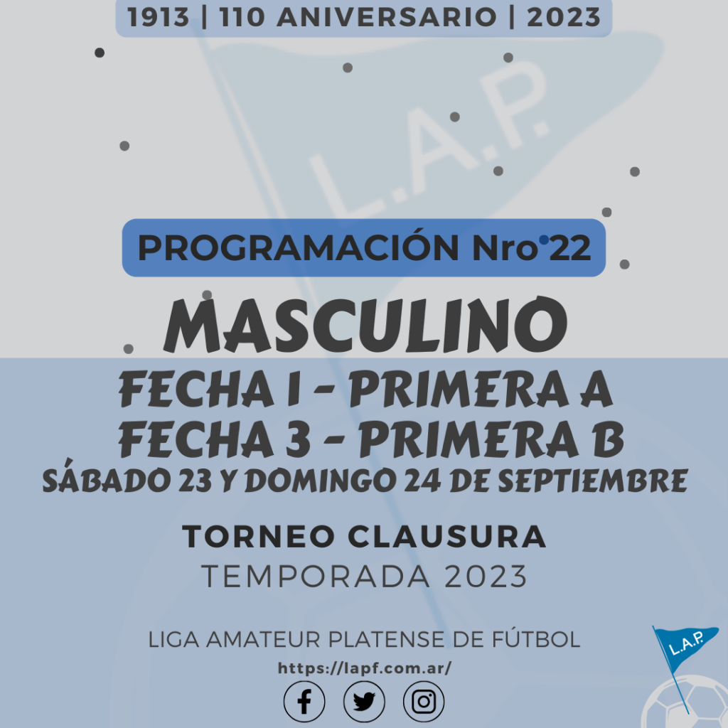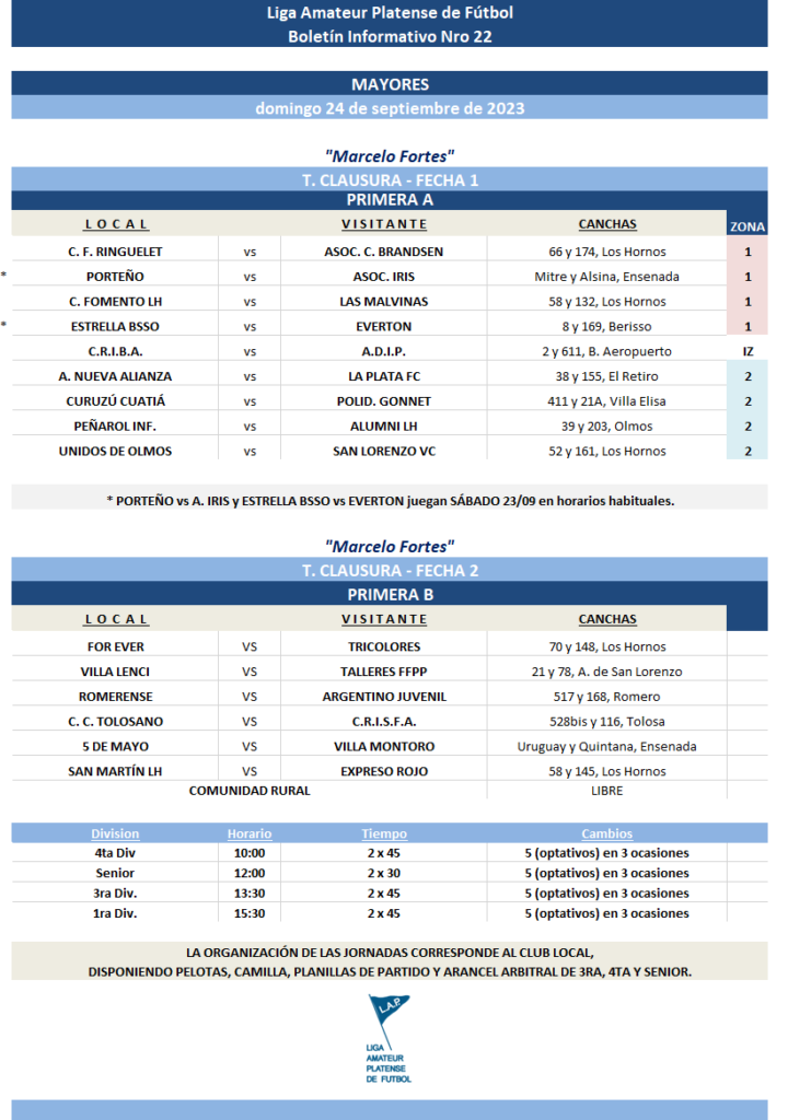 Compartimos la programación de partidos correspondientes a la FECHA 1 de Primera Divisional A y la FECHA 3 de Primera Divisional B del Torneo Clausura “Marcelo Fortes” de la Liga Amateur Platense de Fútbol a disputarse el próximo fin de semana.