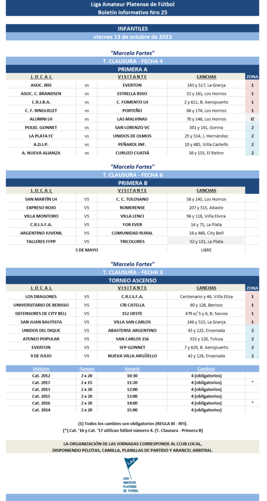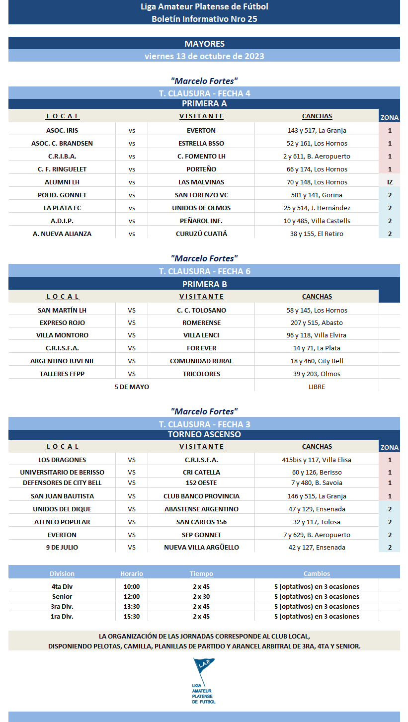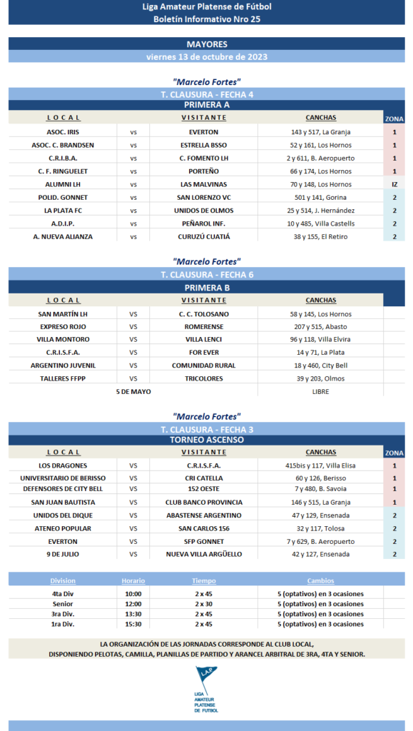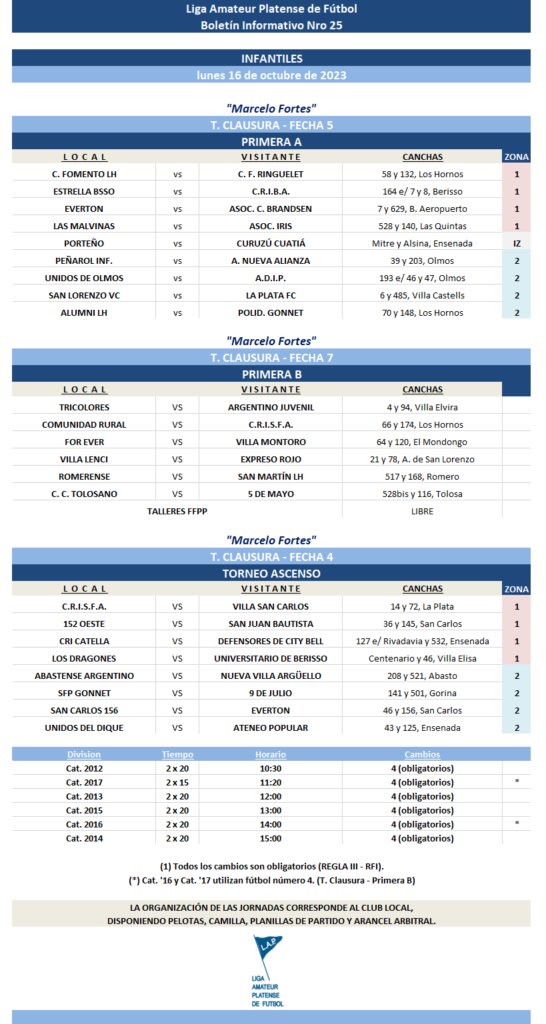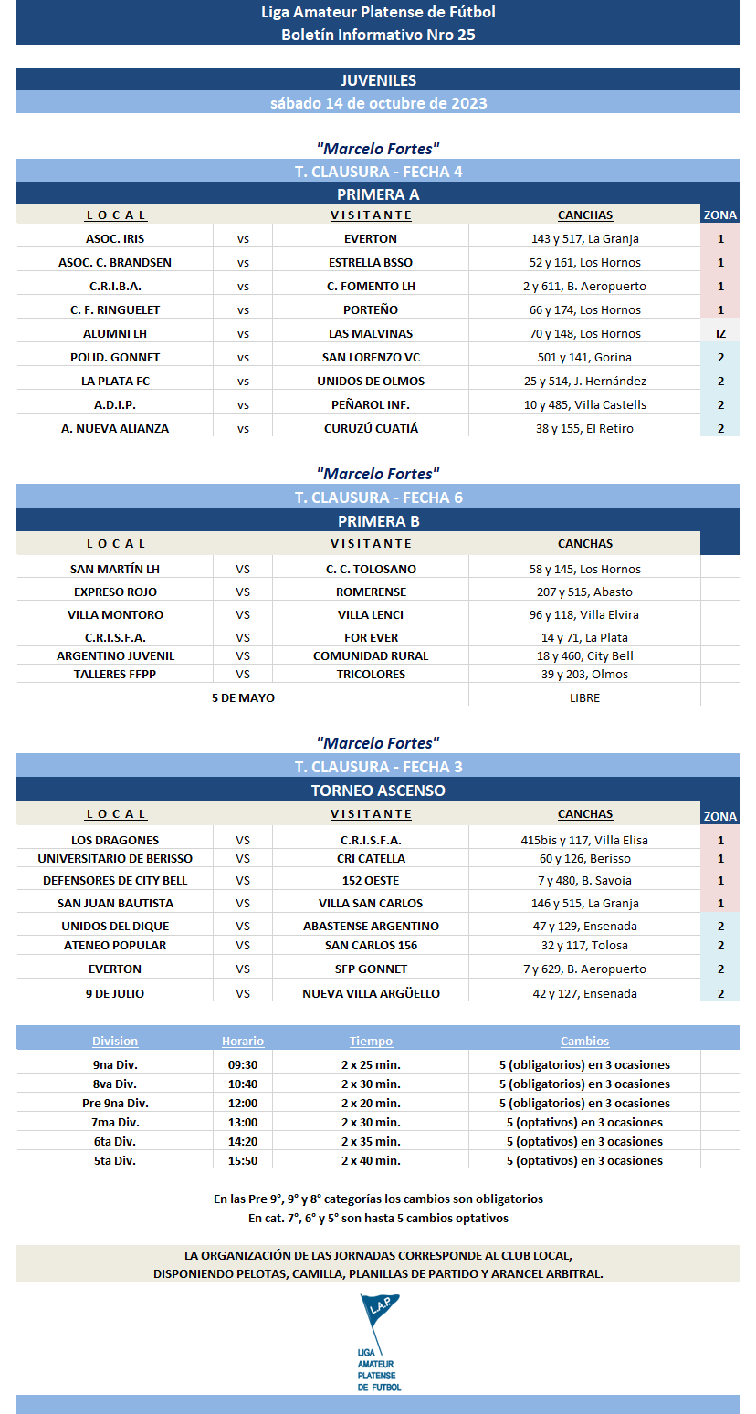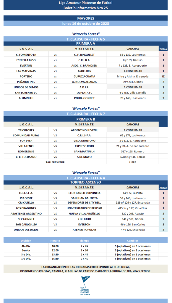 ACLARACIÓN: El lunes 16/10 se disputarán ÚNICAMENTE INFANTILES Y MAYORES de la FECHA 5 de Primera A, de la FECHA 7 de Primera B y de la FECHA 3 del Torneo Ascenso de Fútbol Masculino del Torneo Clausura “Marcelo Fortes”, quedando prevista la jornada de JUVENILES correspondiente para el día sábado 21/10.