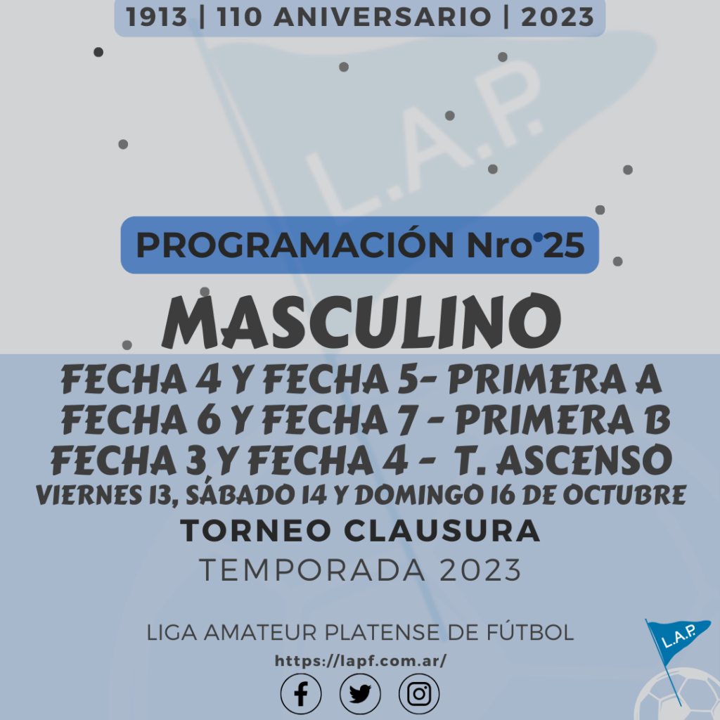 Compartimos la programación de partidos correspondientes a las FECHAS 4 y 5 de Primera Divisional A, las FECHAS 6 Y 7 de Primera Divisional B y las FECHAS 3 Y 4 del T. Ascenso de Fútbol Masculino del Torneo Clausura “Marcelo Fortes” de la Liga Amateur Platense de Fútbol a disputarse el próximo fin de semana.