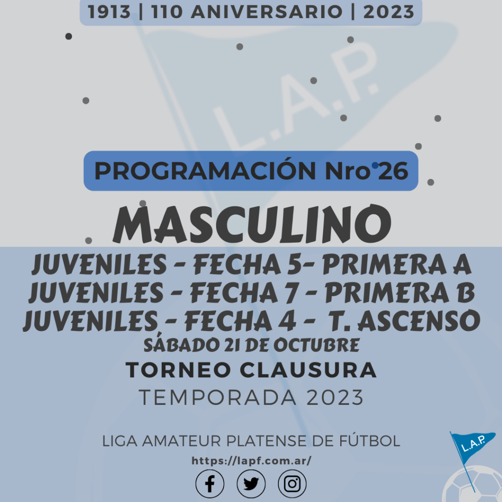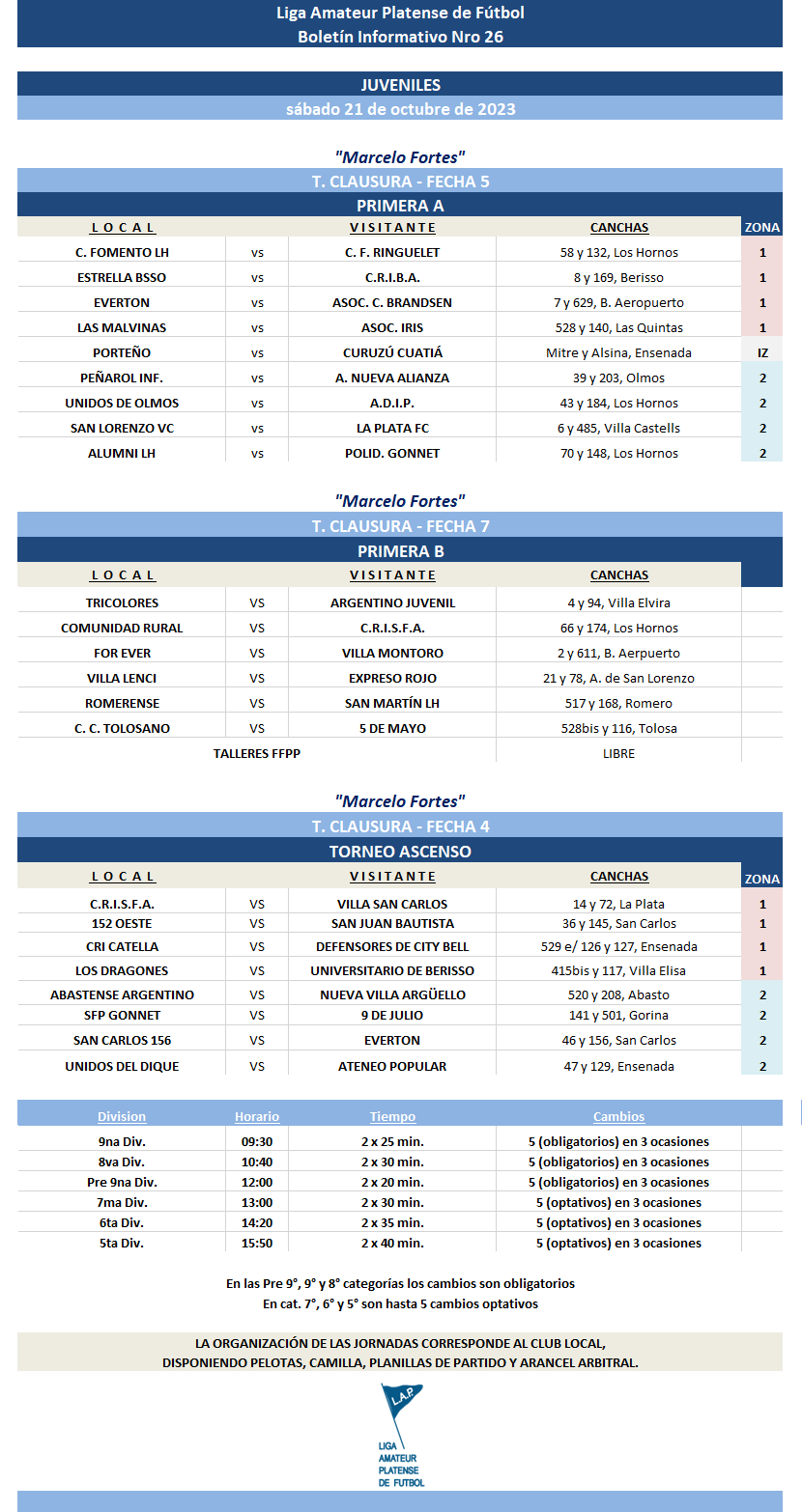 Compartimos la programación de partidos correspondientes a las FECHAS 5 de Primera Divisional A, las FECHAS 7 de Primera Divisional B y las FECHAS 4 del T. Ascenso de Fútbol Masculino únicamente de divisiones #Juveniles del Torneo Clausura “Marcelo Fortes” de la Liga Amateur Platense de Fútbol a disputarse el próximo sábado 21 de octubre.