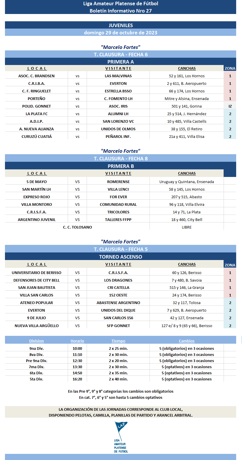 Compartimos la programación de partidos correspondientes a las FECHAS 6 de Primera Divisional A, las FECHAS 8 de Primera Divisional B y las FECHAS 5 del T. Ascenso de Fútbol Masculino únicamente de divisiones #Juveniles del Torneo Clausura “Marcelo Fortes” de la Liga Amateur Platense de Fútbol a disputarse el próximo fin de semana.